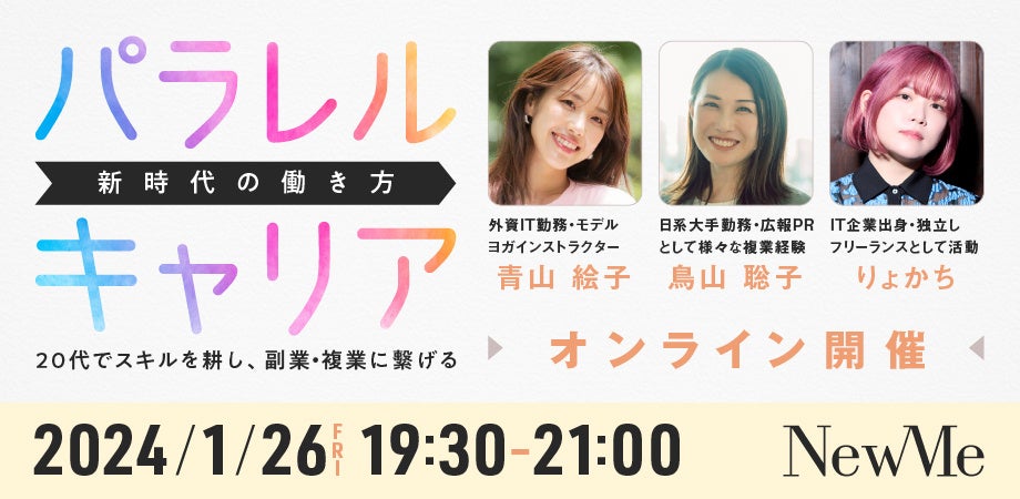 「自分の人生を自分でハンドリングし、前向きに生きる女性を増やす」をビジョンとし、2023年6月に創業したNewMe株式会社(本社:東京都港区、代表者 : 代表取締役CEO 篠原 さくら・代表取締役CCO笹川 友里)は、1月26日(金)、オンラインイベント「新時代の働き方「パラレルキャリア」 〜20代でスキルを耕し副業・複業に繋げる〜」を開催いたします。