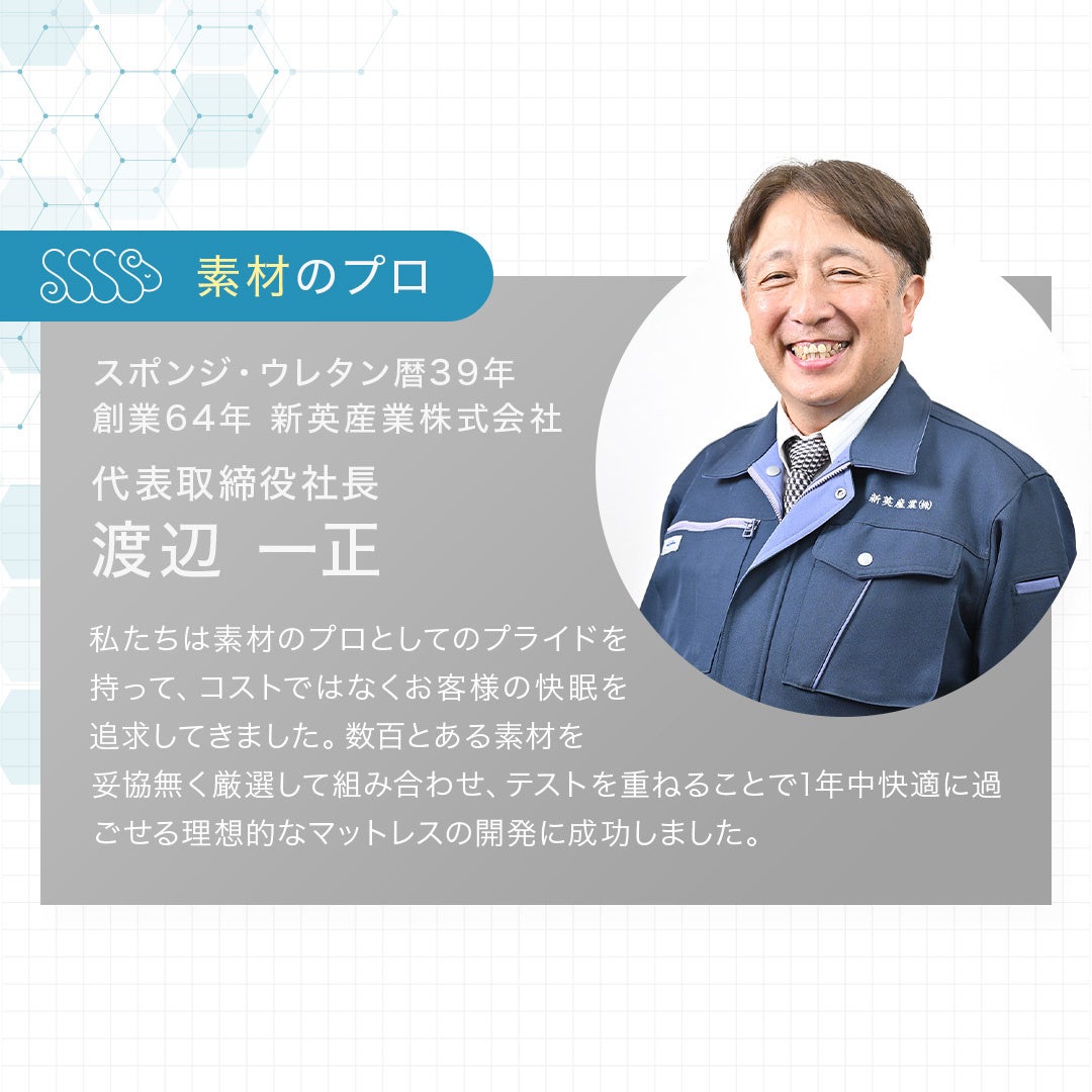 本商品は、応援購入サービス「Makuake」にて100万円超のご支援をいただいた注目の快眠アイテム。睡眠学博士・白濱龍太郎氏の監修のもと、素材開発に長けた新英産業が“日本の四季に合った寝心地”をテーマに開発しました。