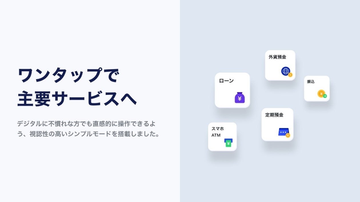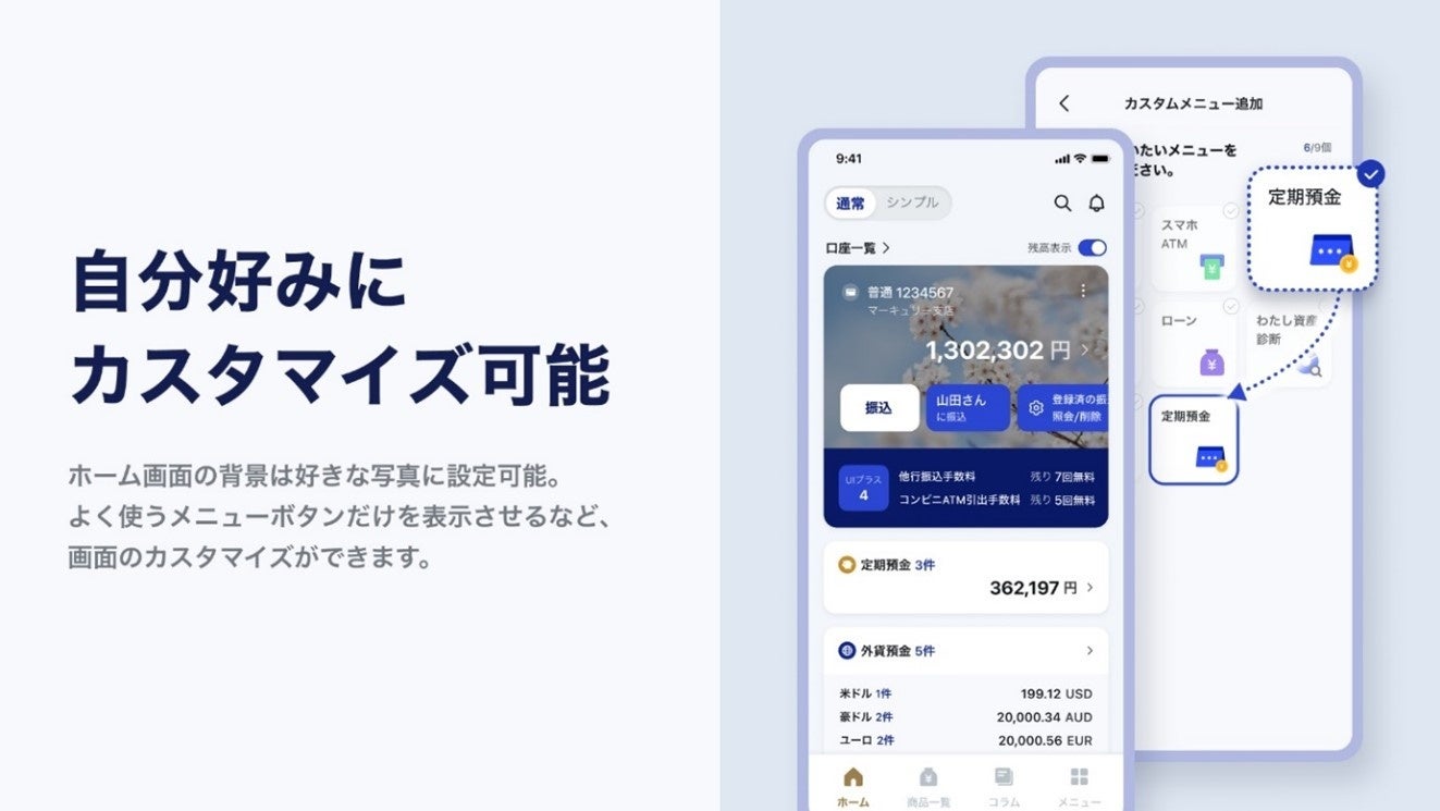 今回のリニューアルでは、日常生活で発生する銀行手続きを誰もが簡単に実施いただけるよう、分かりやすいデザインを取り入れ、自分らしくご利用いただけるようにさまざまな機能を追加いたしました。