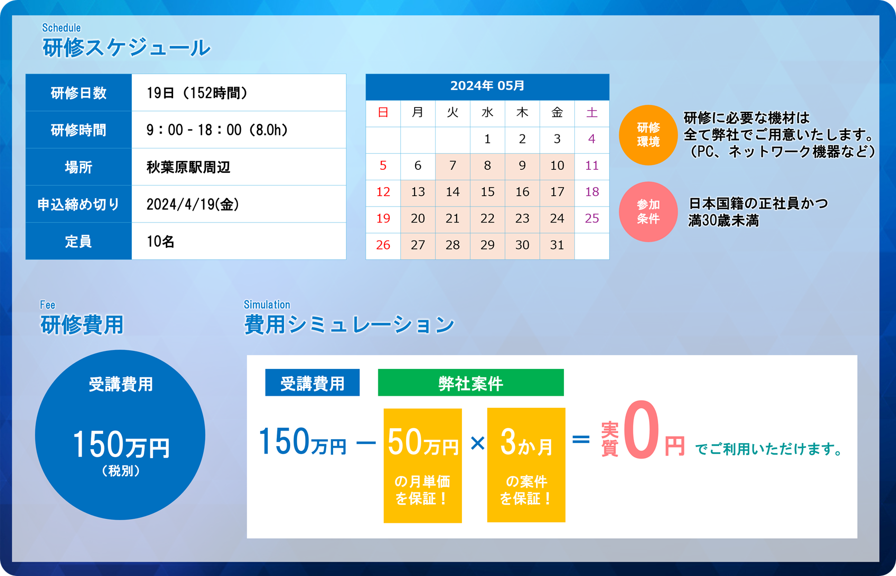 実機を用いた基礎研修を受講された方を対象に当社の案件に参画頂く先着10名限定のサービスです。