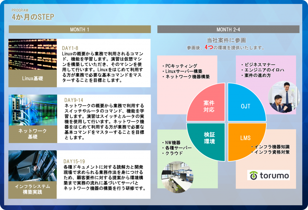 19日間の座学研修でITインフラの基礎(ネットワーク/サーバー)を学びます。