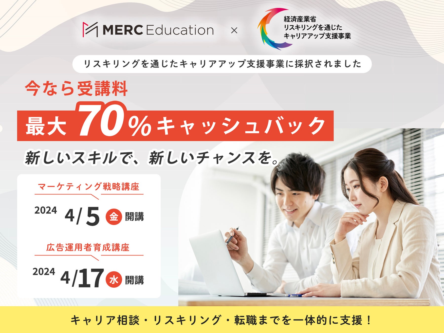 経済産業省「リスキリングを通じたキャリアアップ支援事業」に株式会社MERCが採択され、補助対象となる「広告運用者育成講座」「マーケティング戦略講座」申込受付スタート