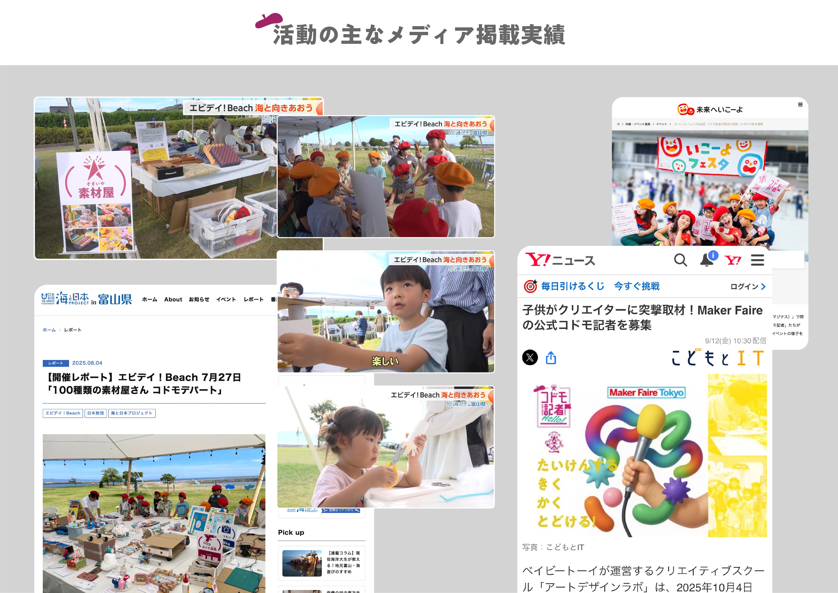 ご提供いただいた素材は、企業・団体様のお名前と共に会場や公式サイト、SNSでご紹介し、サステナビリティと創造教育の両面から未来を育む活動として発信してまいります。