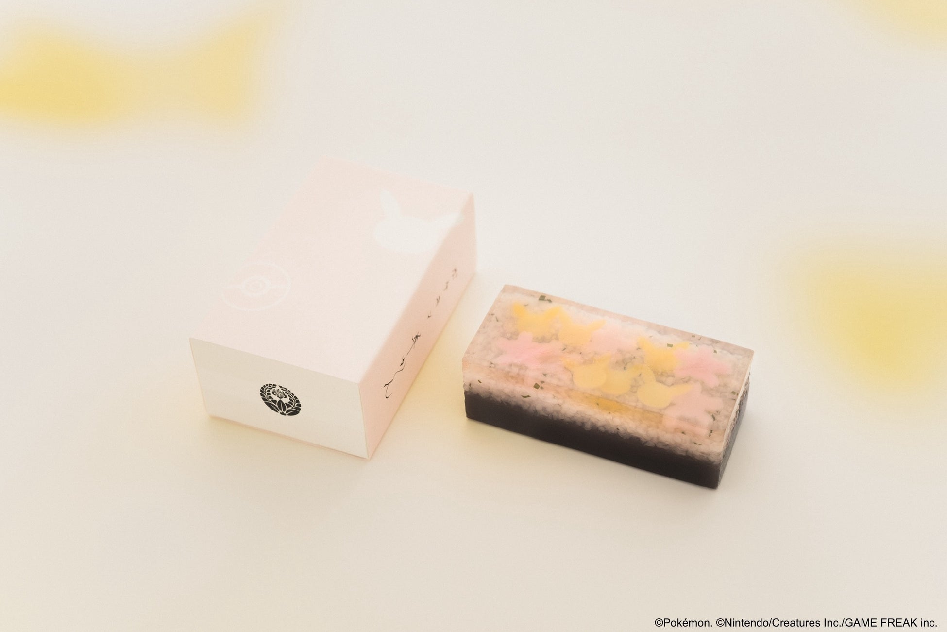 練り羊羹のベースに関西の桜餅の特徴である道明寺を層で重ね、その上に羊羹でできたピカチュウとチェリム(ポジフォルム)を並べました。