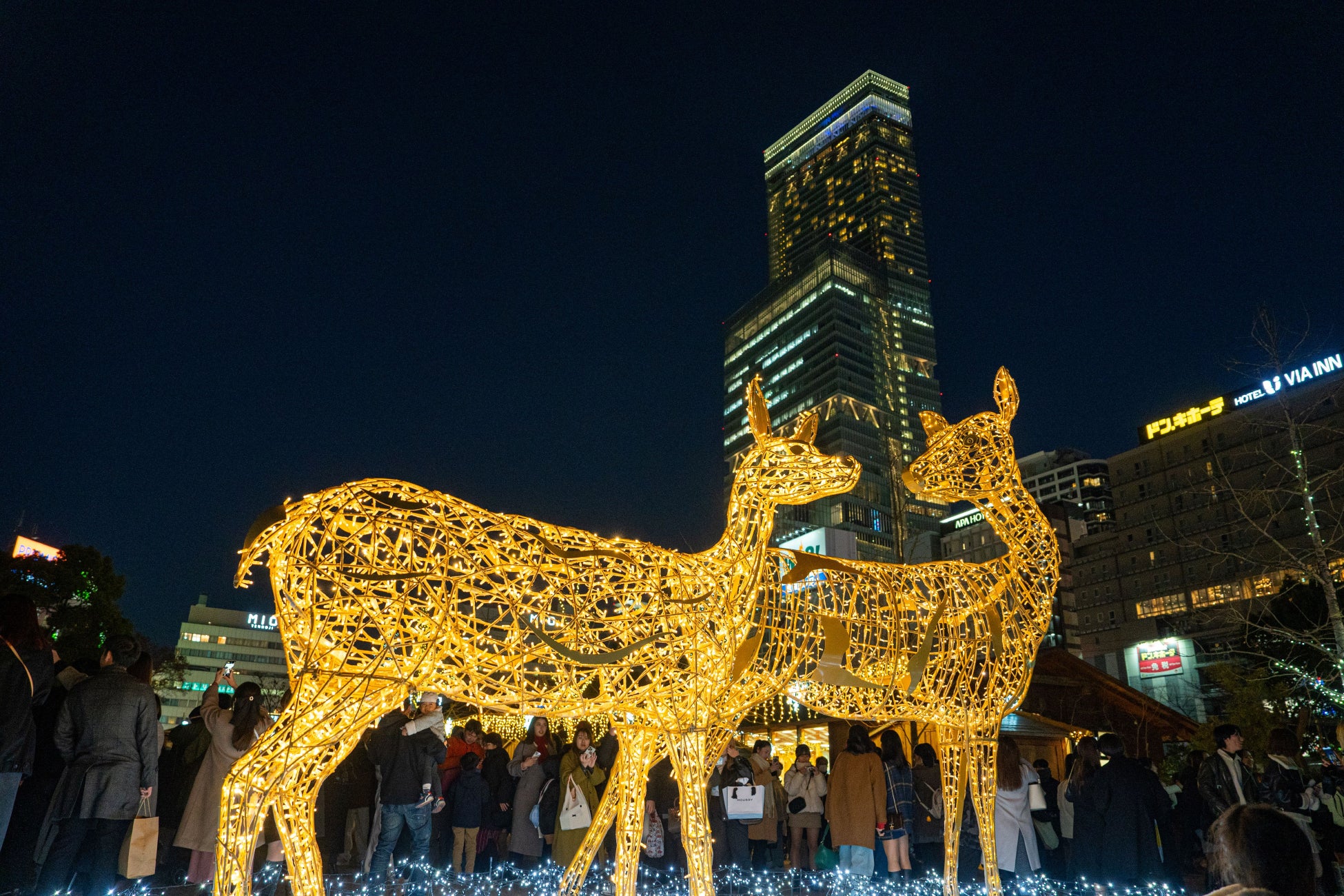 てんしばにそびえ立つ3本の大きなクリスマスツリー、キラキラと装飾された飲食店のヒュッテ(木の小屋)など、てんしばがあたたかな光に包まれた特別な空間に大変身!!