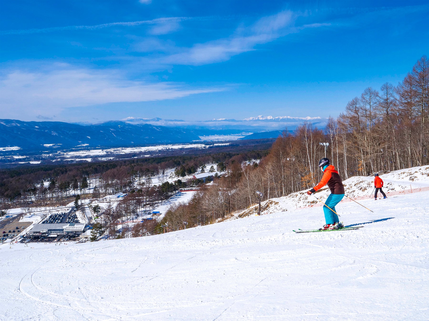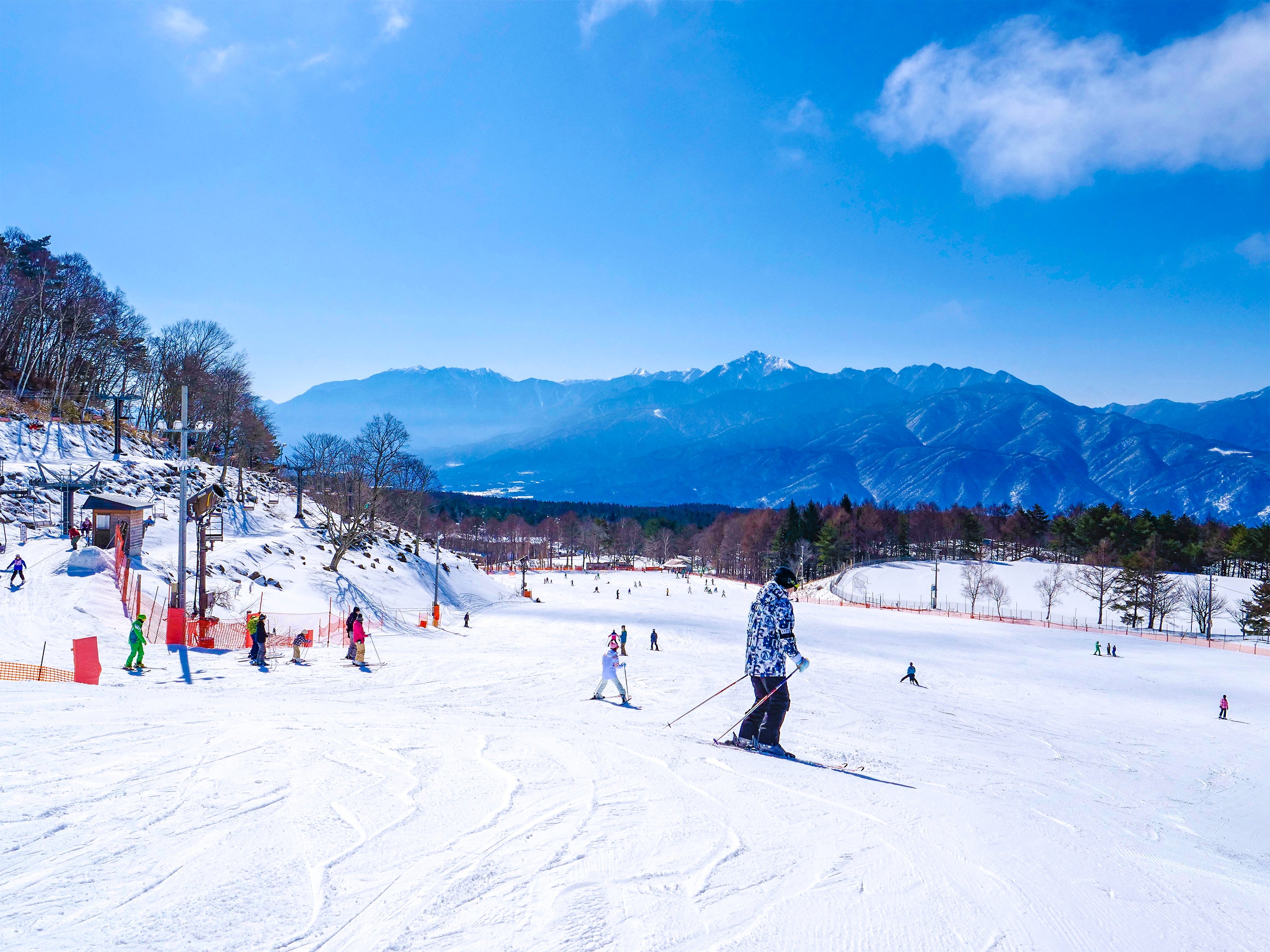 富⼠⾒高原スキー場(⻑野県富⼠⾒町)は南・北アルプスや諏訪湖が臨める絶景のロケーション。スキーデビュー・初心者にぴったりの広い緩斜面の「ロマンスゲレンデ」と、上級者のトレーニングに最適な本格的なバーンがある「センターゲレンデ」があります。