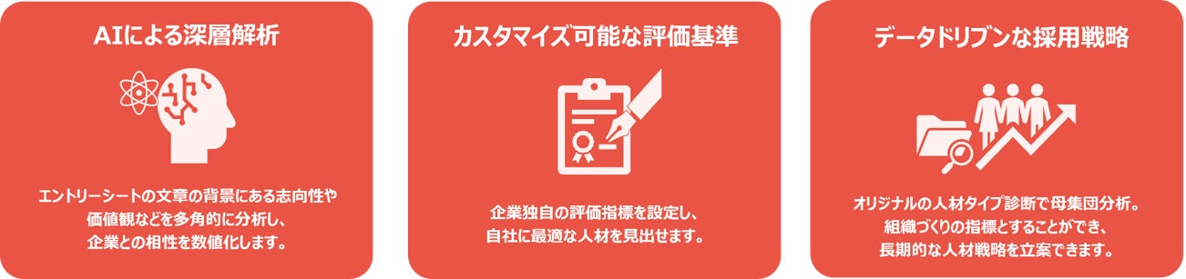 採用選考においては、候補者の人となりや志向を探るべく何度も面接やテストを繰り返しますが、「Chemii!!(ケミィ)」は、これまで面接でしか測ることができなかった「自社に合う人材かどうか」を、エントリーシートと企業情報をAI解析にかけることによって客観的なデジタルスコアで判断し、選考初期段階で「カルチャーマッチ度」の評価をつけることができるようになる画期的なAIツールです。