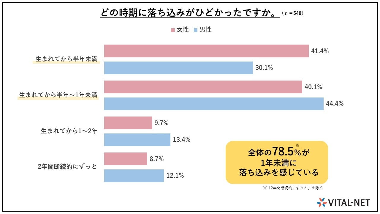 ・「よくあった・ときどきあった」と回答した方に「落ち込みがひどかった時期」を聞くと、78.5%が「生まれてから1年未満」(生まれてから半年未満・半年~1年未満の計)と回答。