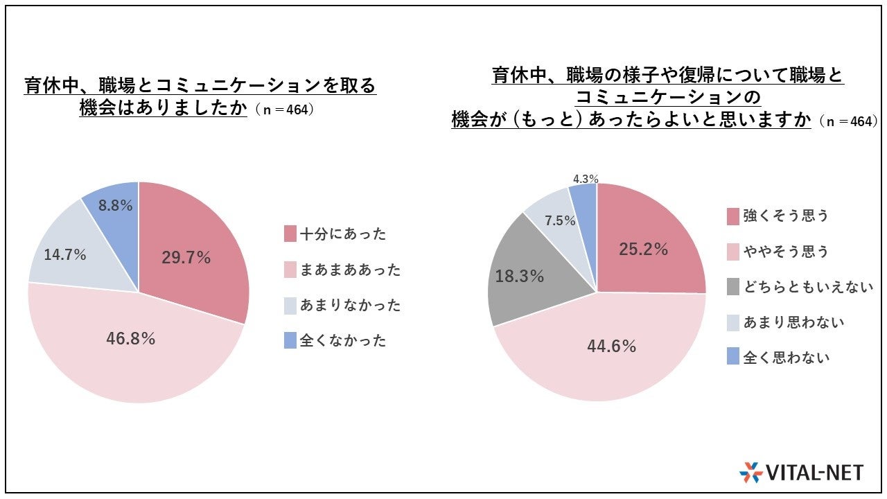 ・同じく、69.8%が「育休中に職場の様子や復帰について職場(上司や人事担当者など)とコミュニケーションの機会が(もっと)あったらよい」と「強く思う・やや思う」と回答。