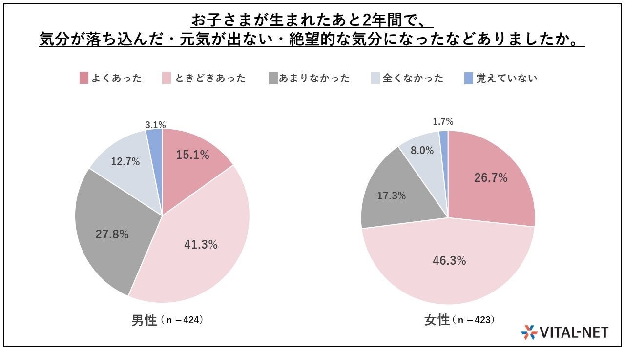 ・全体の64.7%が、「お子さまが生まれたあと2年間で気分が落ち込んだ・元気が出ない・絶望的な気分になったなど」が「よくあった・ときどきあった」と回答。