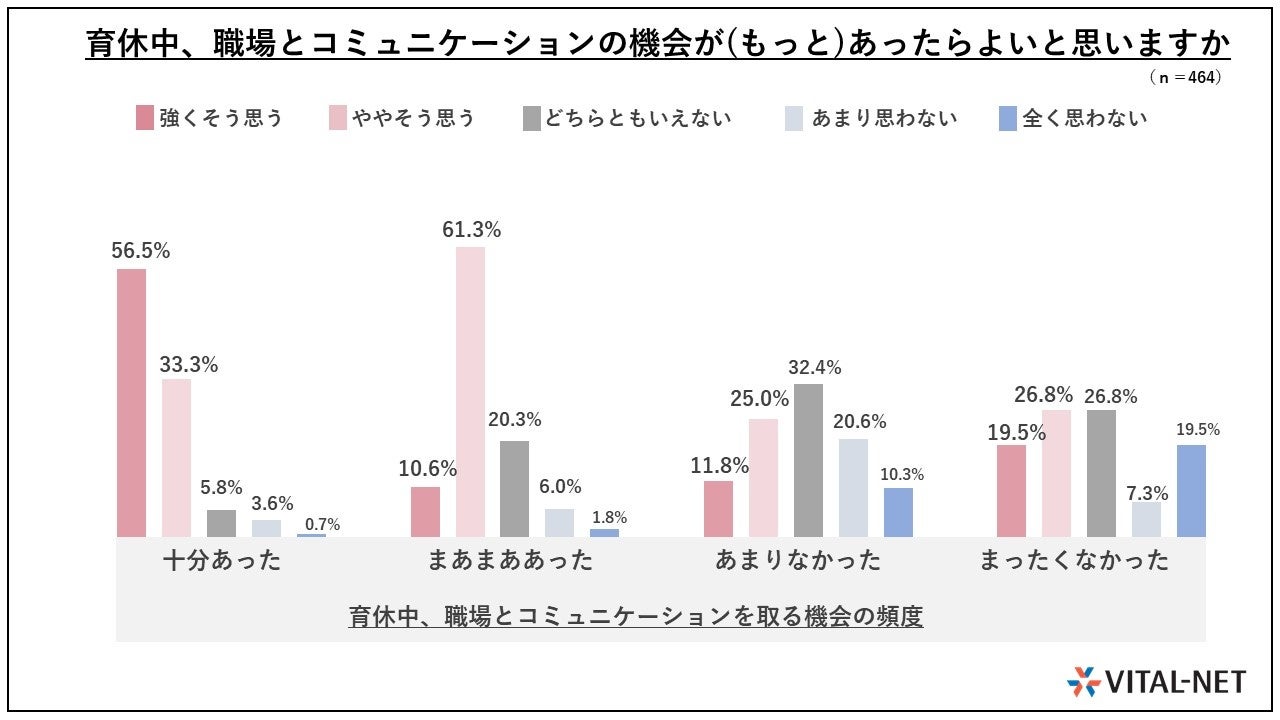 ・職場とのコミュニケーションをとる機会が「十分にあった」と回答した方のうち、実に56.5%が、育休中の職場とのコミュニケーションの機会を強く望んでいる。