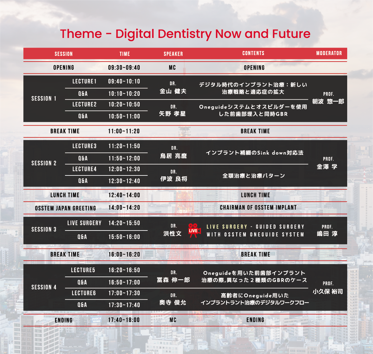 本シンポジウムは「Digital Dentistry Now and Future」をメインテーマに、各分野を代表する著名な研究者・臨床家の先生方を講師陣に、歯科医師向けの合計4つのセッションを開催し、座長を含む計11名の歯科大学教授および院長が6つの講演とライブサージェリーを披露します。