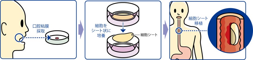 ・ESDを行った直後の患者さんやESD後の難治性狭窄の患者さんに、自身の口腔粘膜組織および血液を培養し作製した細胞シートを、がん除去後の創傷部分へ内視鏡的に移植します。