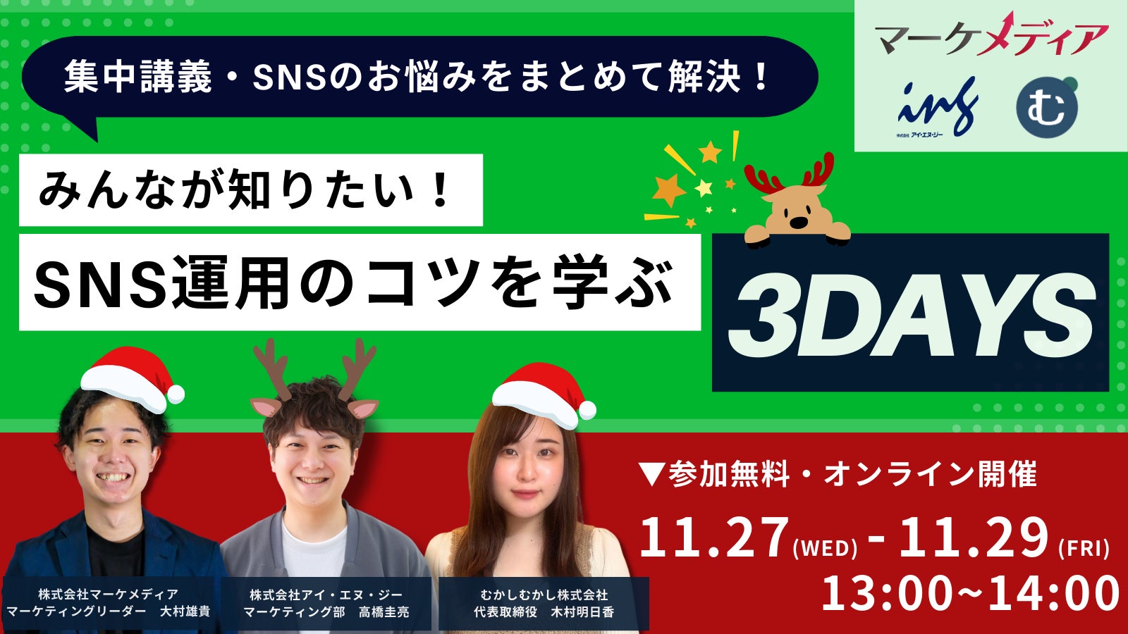 デジタルマーケティング支援するむかしむかし株式会社(本社:東京都渋谷区、代表取締役:木村明日香、以下むかしむかし)は、2024年11月27日(水)〜11月29日(金)の3日間に渡り、株式会社マーケメディア様、株式会社アイ・エヌ・ジー様と共催で、オンラインウェビナー「SNS運用の悩みを解決!みんなが知りたいSNSのコツを学ぶ3Days」を開催します。