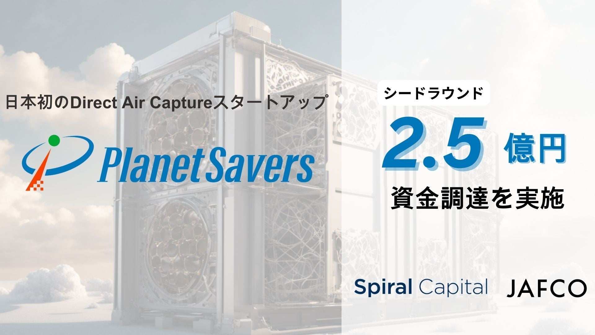 「気候変動を食い止め、次世代に美しい地球を残す」をミッションに掲げる東京大学発のDirect Air Captureスタートアップ、Planet Savers株式会社(本社:東京都渋谷区、代表取締役:池上京、以下「Planet Savers」)は、Spiral Capital株式会社(Spiral Capital Japan Fund 3号投資事業有限責任組合)とジャフコ グループ株式会社(ジャフコV7投資事業有限責任組合、ジャフコSV7-S投資事業有限責任組合)の2社から合計2.5億円の資金調達をシードラウンドで実施しました。