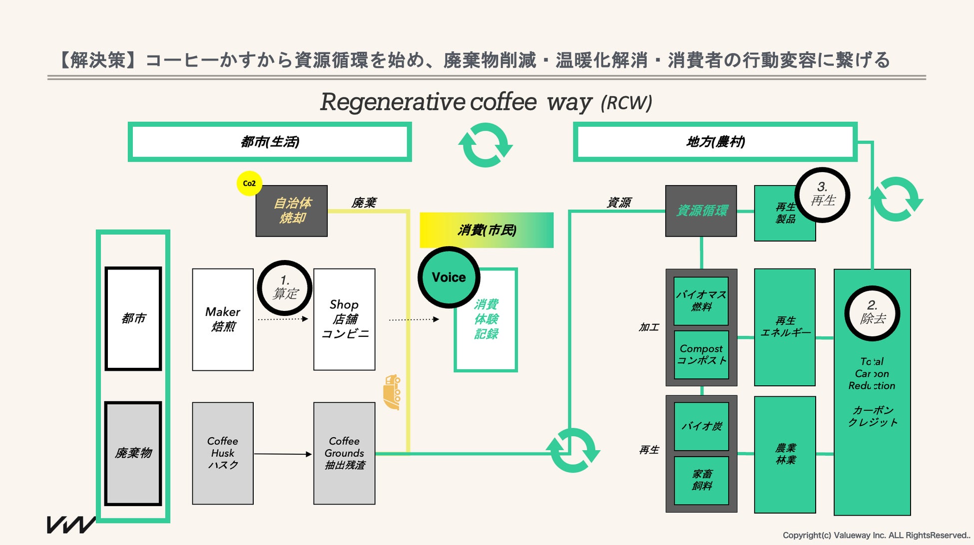 そこでValue wayでは、生活に最も馴染みのある食の1つ「コーヒー」に着目し、製造時のコーヒーハスクおよび消費後のコーヒーカスを回収・炭化・農地施用などを通して、コーヒーカスから資源循環を始め、廃棄物削減・温暖化解消(カーボンクレジットの創出)、消費者の行動変容を一体的に取り組むプロジェクトRegenerative Coffee Way(RCW)を提案し、国内外で推進しております。