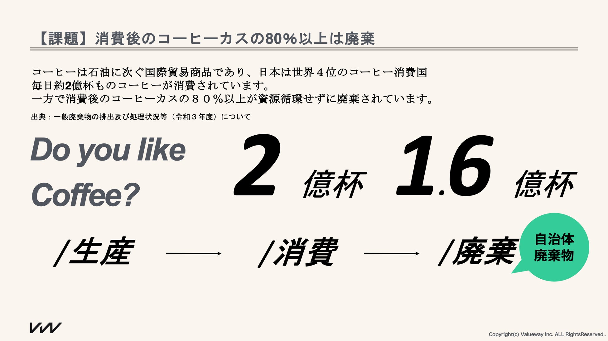 世界で1日約20億杯消費され、消費量も年々増加しているコーヒーは、日本でも毎日2億杯のコーヒーが飲まれている一方、消費後のコーヒーカスの大半が資源循環されずに廃棄されています。一方、温室効果ガスによる気候変動で、このままでは2050年には生産量が半減すると言われています。(Coffee 2050年問題)。廃棄物削減と温室効果ガス削減は必須命題。 気候変動対策として官民一体の緩和策実行が不可欠だがIPCC1.5度報告の基準を達成するには更なるアクションが必要な状況ですが、消費者の気候変動対策への取組意欲はあるものの、実際に行動している方は限られています。