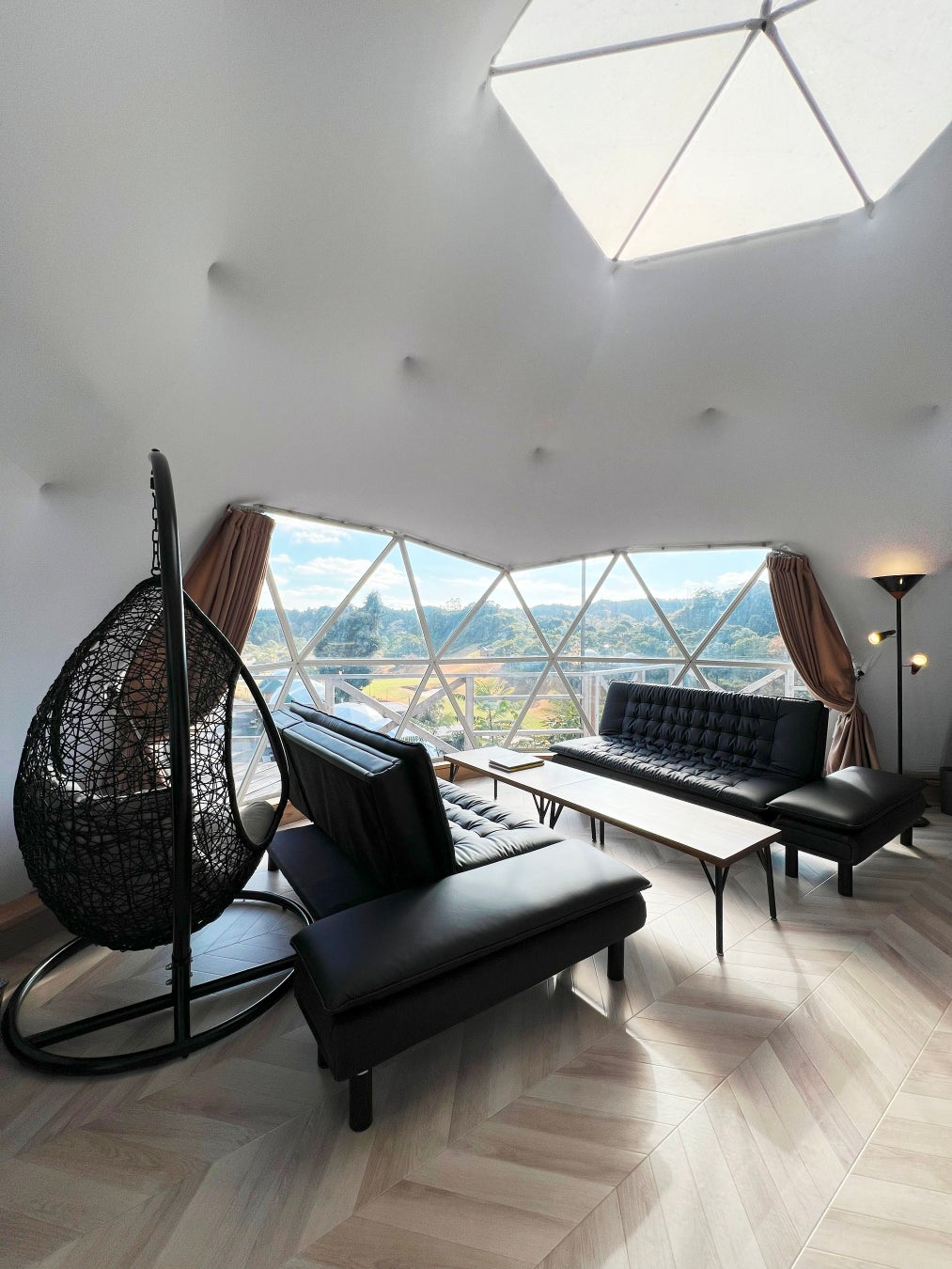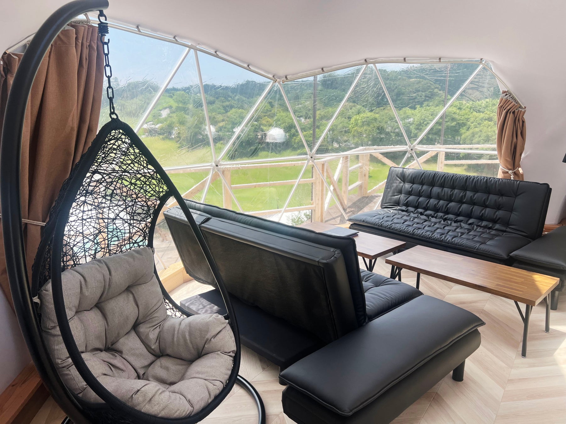 55平米のメイン2連ドームテント。ソファーやハンギングチェアーを完備し、テント内でもお寛ぎいただける空間となっております。