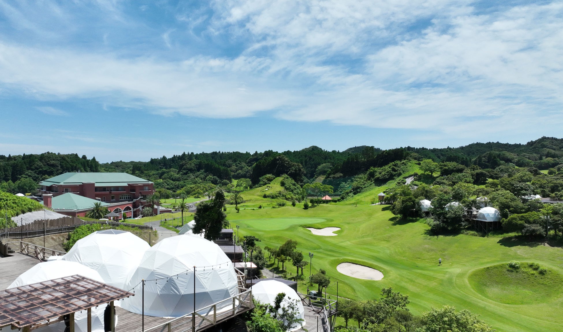 都心より約90分、千葉県夷隅郡御宿町にある、ゴルフ場とホテル・グランピング場を完備した緑に包まれたリゾート施設。月の砂漠で有名な御宿のビーチも近く、海も山も楽しめるロケーションが人気。広大な施設内には、アスレチックやフットゴルフ場、バギーカートコース、ポニーパークなど子供から大人まで楽しめるファシリティがいっぱいです。