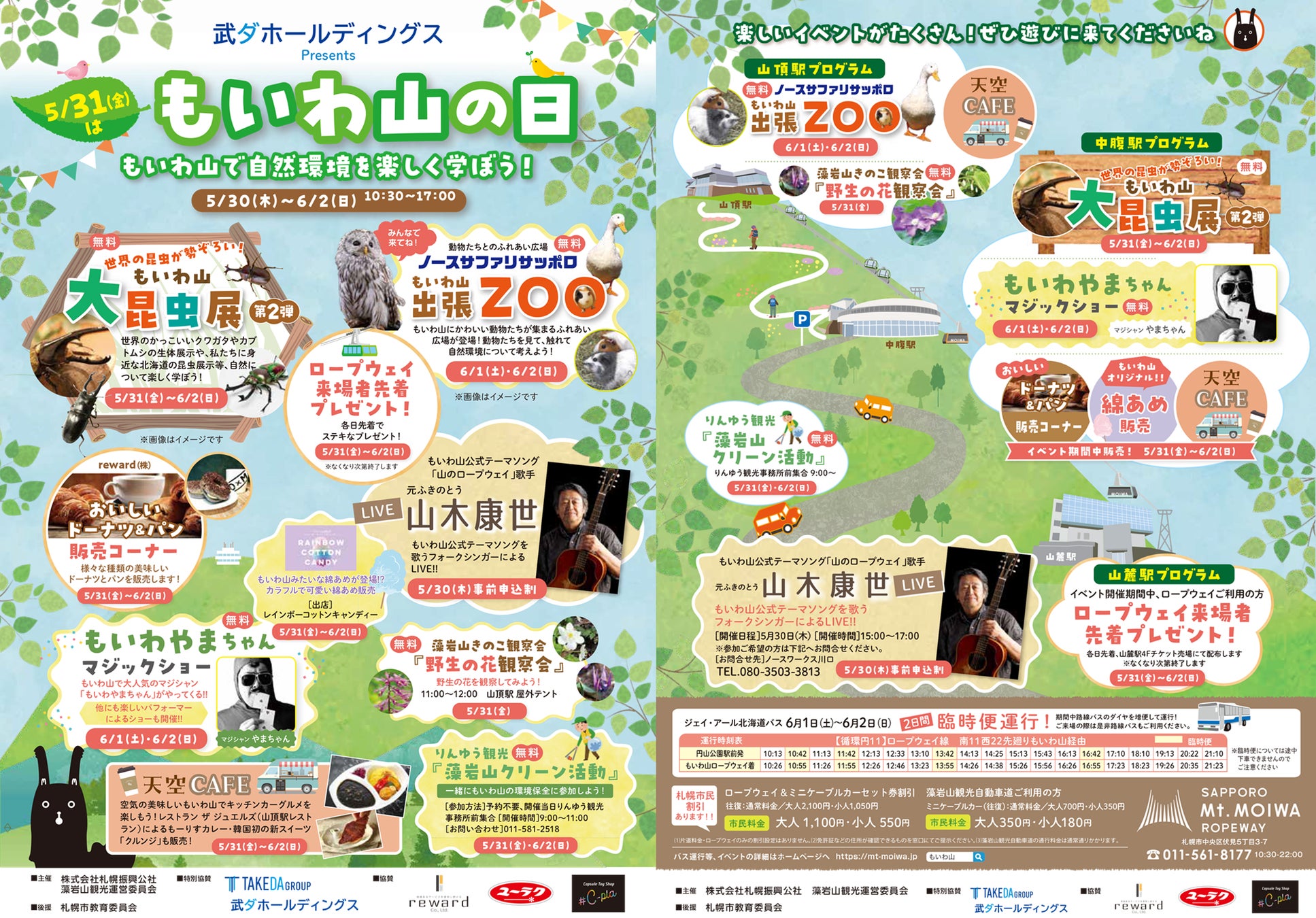 藻岩山の標高531mにちなんで5月31日を「もいわ山の日」とし、5⽉30⽇(木)~6⽉2⽇(日)の4日間でイベントを開催します。ノースサファリサッポロの出張ZOOや大昆虫展など、お子様が自然環境について楽しく学ぶことができるコンテンツが盛りだくさんです。ほかにも、マジックショーや人気キッチンカーの出店もあり、魅力満載のイベントとなっております。