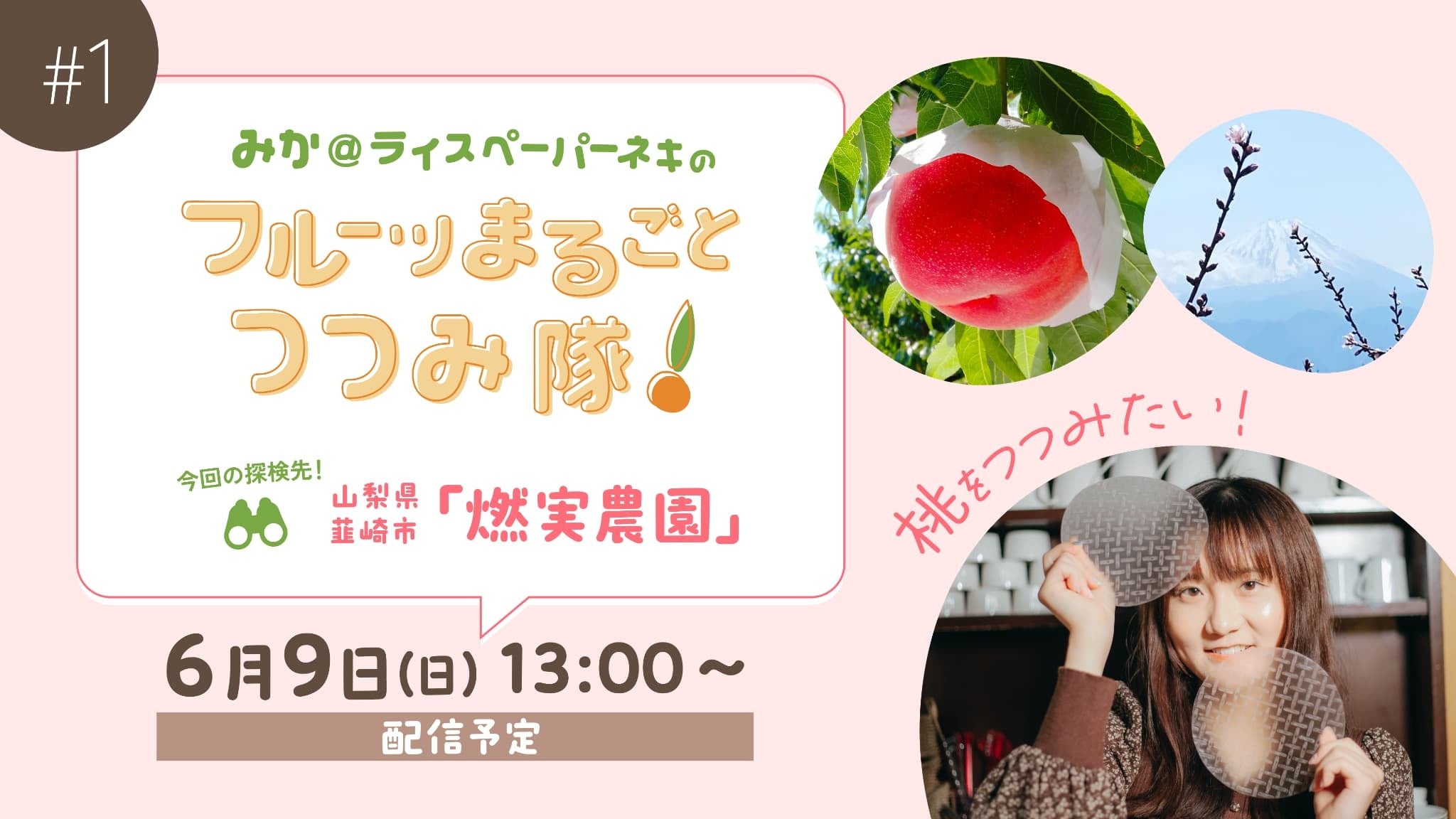 本番組は、みか@ライスペーパーネキが「つつみ隊!」の隊⻑に扮し、「ライスペーパーにまるごとつつみたい」フルーツを探す番組です。しまけん隊員とともに、全国各地の様々なフルーツ農家を訪問し、農家さんにインタビューをしながらフルーツや生産者さんの魅力を伝え、フルーツを販売します。 第1弾では、山梨県韮崎市で桃を栽培する燃実農園をご紹介します。