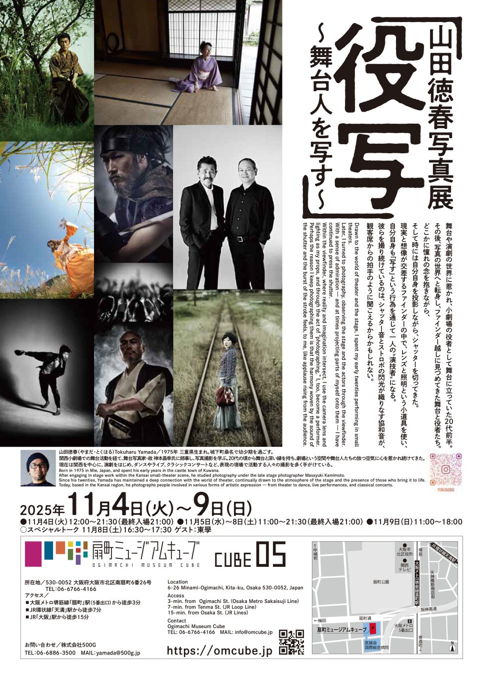 山田は20代前半に小劇場で舞台活動を経て写真の道へ転身。以降、ファインダー越しに多くの表現者たちを見つめ、撮影を重ねてきました。被写体への敬意と共感を込めた作品群は、舞台という非日常の世界に息づく人間のエネルギーを伝えます。