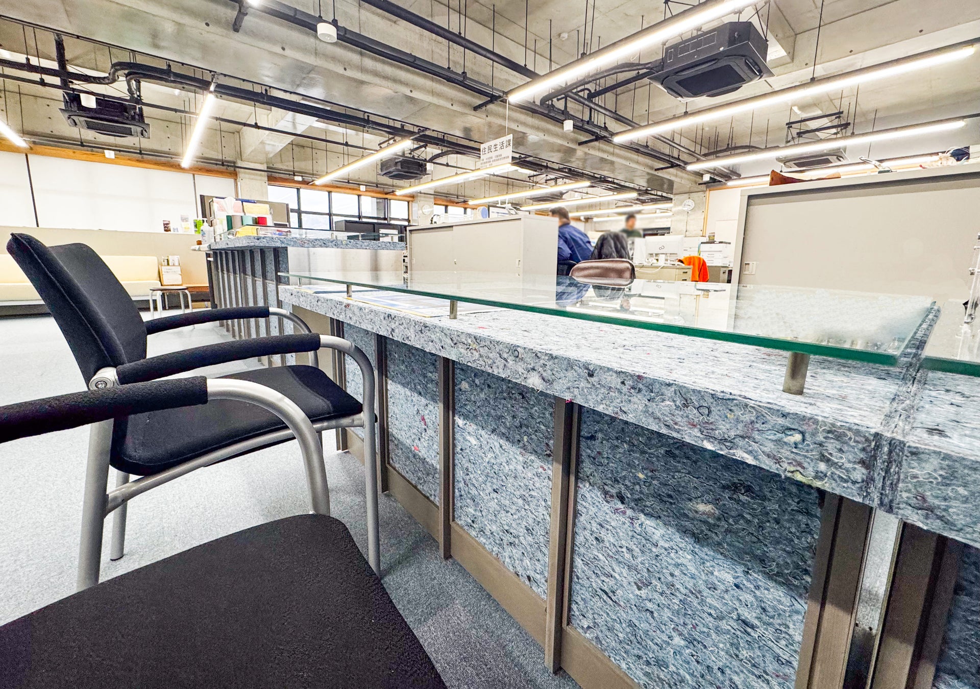 Rebornfber®ボードを使用した家具は、海士町新庁舎の受付テーブルをはじめ、1階のコミュニティスペースの棚や掲示板などにもご使用いただきました。いずれも庁舎に訪れる島民の目に留まりやすいアイテムのため、目で見て実際に触れて愛用してもらうことで、島内に資源循環の意義を伝える役割を担っています。