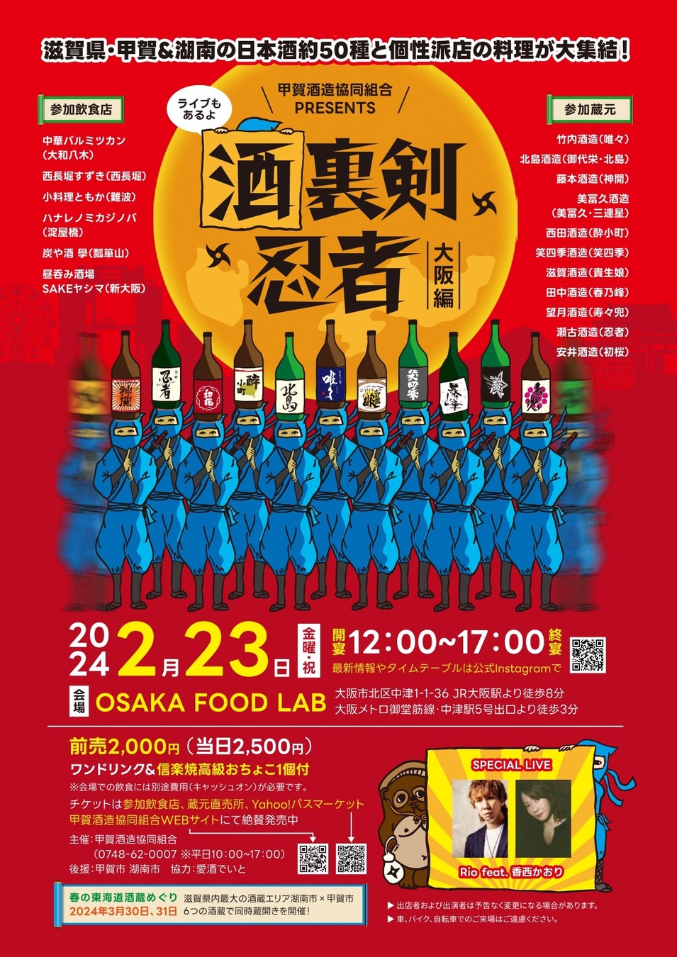2024年2月23日大阪フードラボにて、甲賀地域全11蔵約50種の厳選日本酒と6店の在阪飲食店の酒肴が楽しめる立食フェスイベント「酒裏剣忍者~大阪編~」を開催。