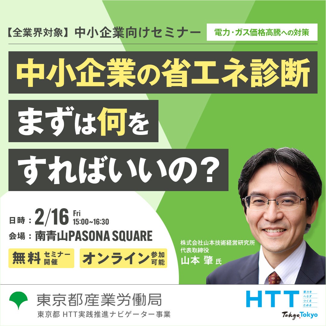 東京都産業労働局 HTT無料セミナー「今からでも遅くない!中小企業が活用できる省エネ診断のポイント」2月16日開催