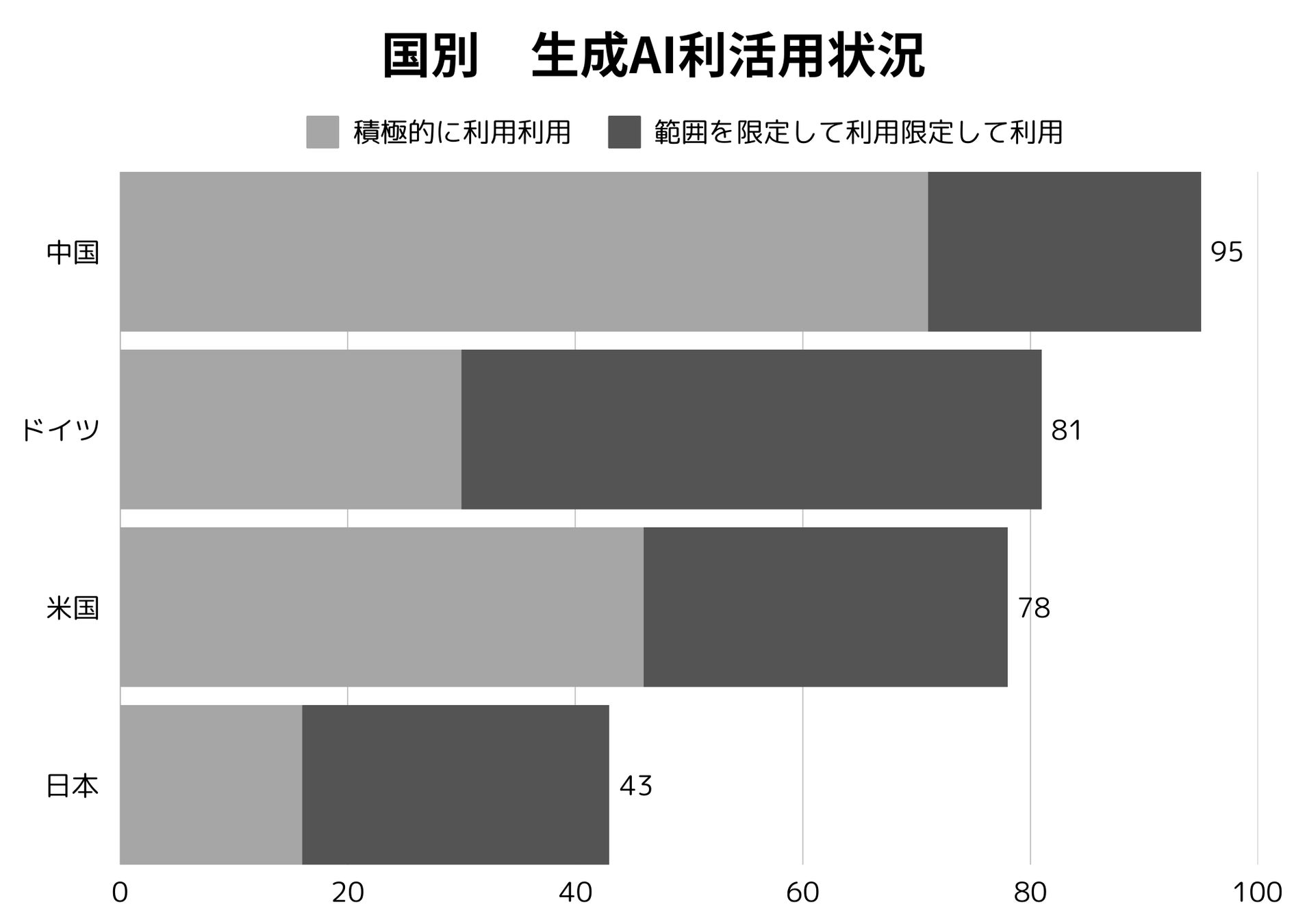 日本企業の生成AI活用は主要国と比べて大きく出遅れています。総務省調査によると、日本企業の活用率は46.8%に留まる一方、米国、ドイツ、中国では約90%の企業が活用を進めています。