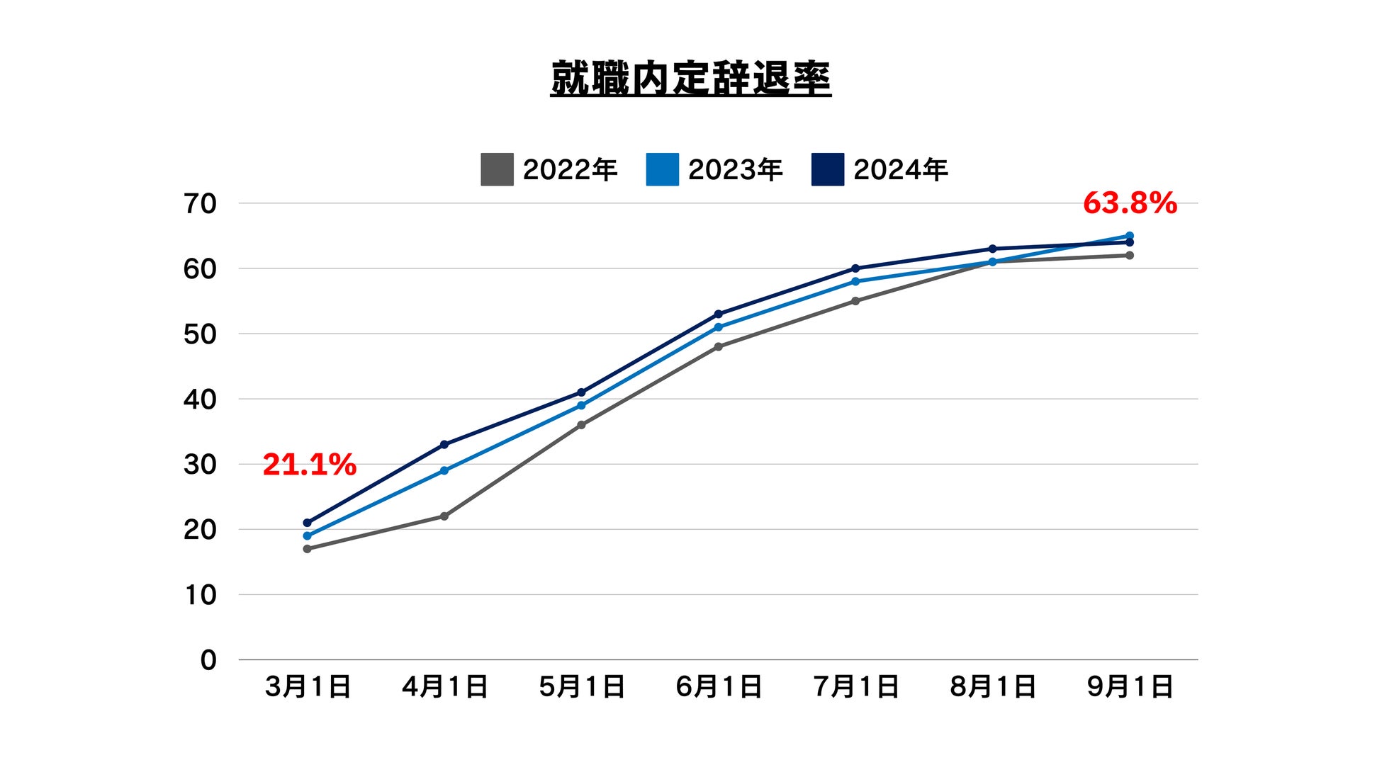 このような就職活動の早期化と長期化の影響も受けて、近年「内定後辞退率の増加」が大きな問題となっています。2024年度のリクルート社の調査によると新卒学生は平均で2.34社の内定を保有しており、新卒の内定承諾後の辞退率は63.8%のため(※4)自社を選択する確率はおよそ3社に1社となっています。採用活動における本質的なゴールは学生の入社そして入社後の活躍であるべきです。就活早期化というトレンド変化に合わせて企業の採用活動においても柔軟な対応力が求められるでしょう。