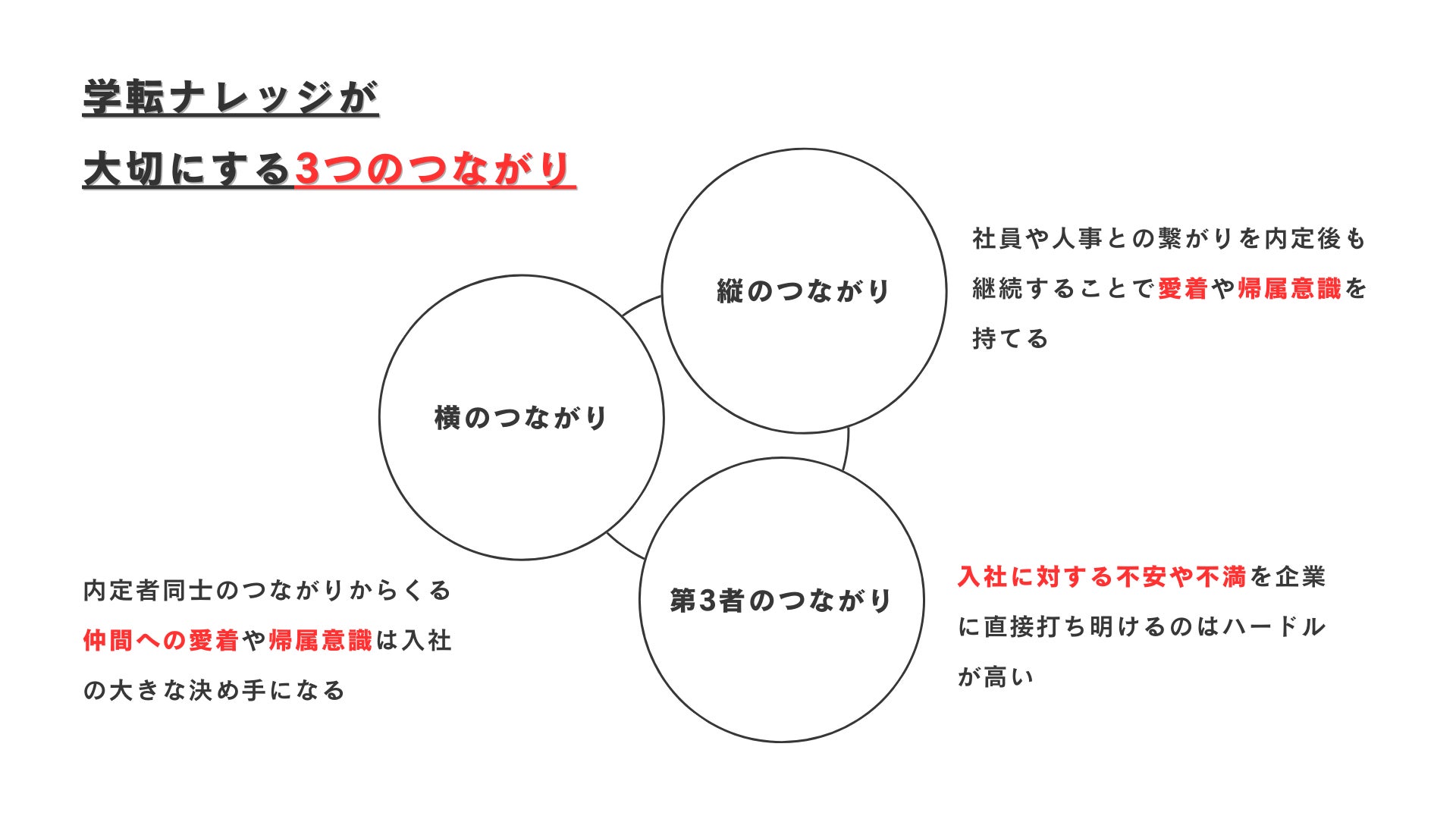 本サービスでは内定者やインターン生への『教育』と『コミュニケーション』を通して離脱を防止し優秀な学生に愛着心を持った上で入社へと繋げます。