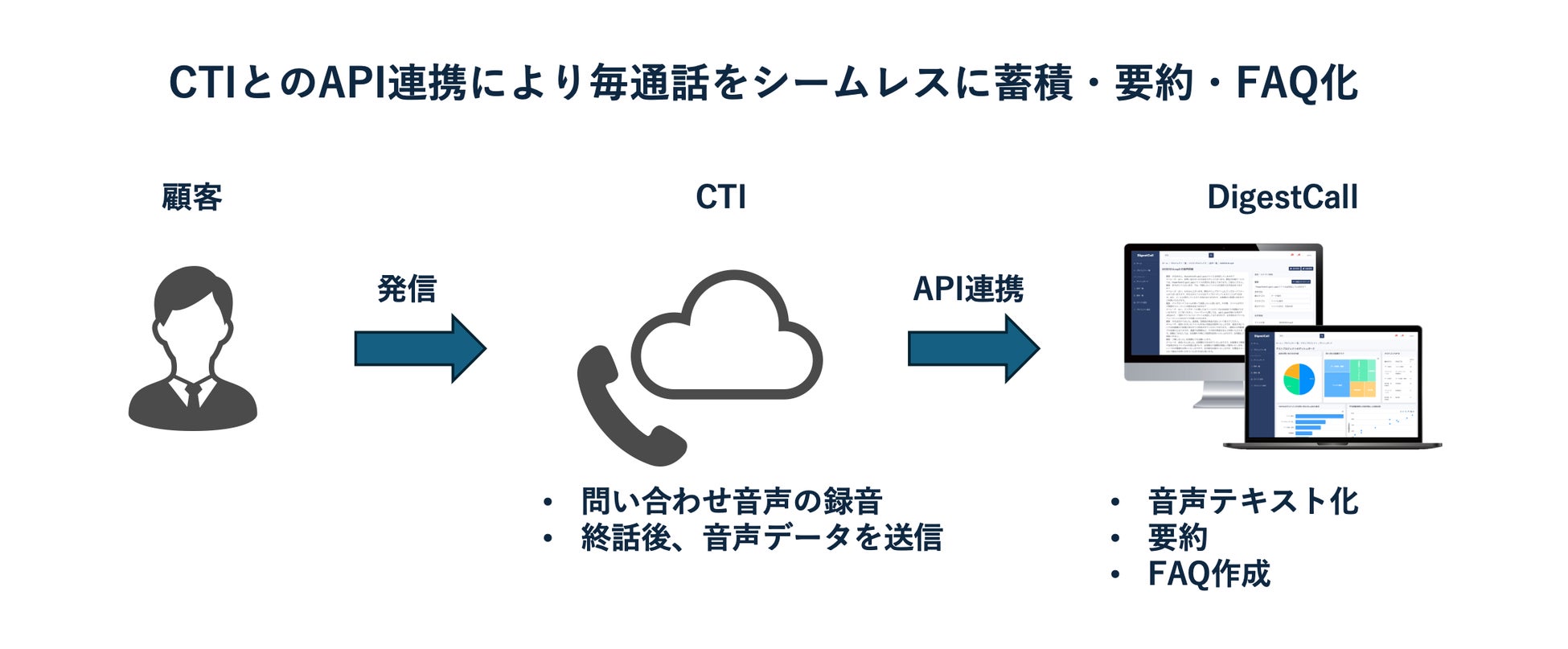 近日中に更改予定のAPI連携機能により、CTIなど外部システムからのDigestCallへのデータ登録や、DigestCallからのデータ取得といった操作をAPI経由で実施することができるようになります。
