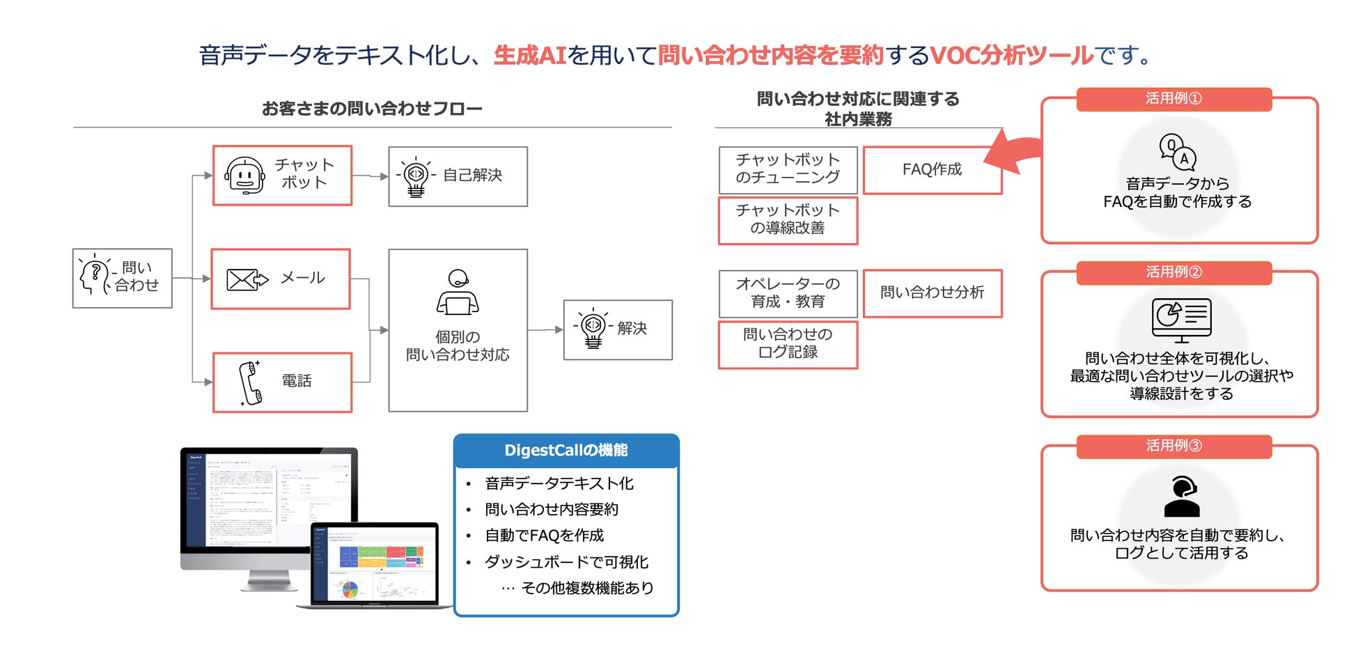 VOC分析サービス「DigestCall」では、音声データのコールログとしてテキスト化、生成AIを用いたコールリーズン(=問い合わせ内容)への自動要約、FAQなどのコンテンツ生成機能を提供しております。