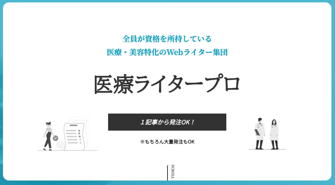 医療ライタープロは、全員が医療系の国家資格を所持している医療・美容特化のWebライターチームです。専門知識が必要な医療・美容ジャンルにおいて、構成作成、執筆、入稿まで「記事制作」に関する全てをサポートいたします。