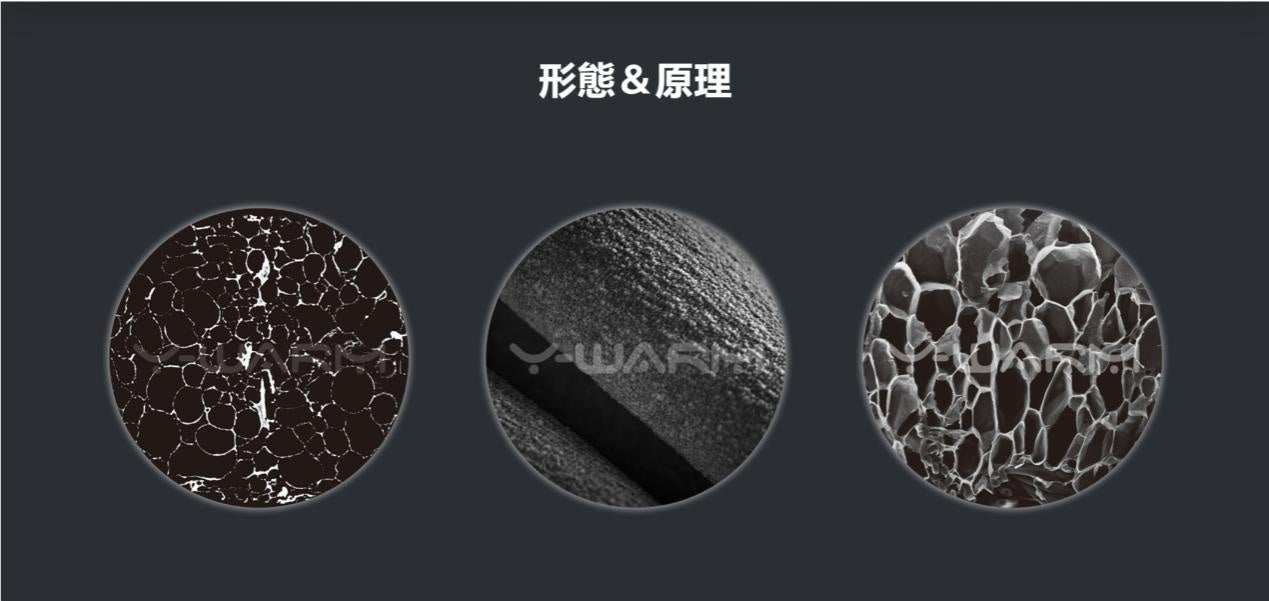 ウェブサイトは、革新的なインスピレーションから技術的な課題まで、物理的な断熱から研究開発のプロセスまで、異なるコラムやセクションを通じてY-Warmを詳細に紹介しています。形態と原理のページでは、CT三次元画像が表示されており、白い部分は閉孔構造のナノレベルの厚さの孔壁、黒い部分は直径がマイクロレベルの孔です;それは骨格を含まず95%以上の孔隙率と閉孔率で、エアロゲルに匹敵する非常に低い熱伝導率を持ちながら、透湿性、速乾性、抗菌性の機能も兼ね備えています。それを表生地と裏地の間に充填することで、冬の衣服に0.7ミリメートルの厚さの断熱保温層を加えるようなものです。断熱層の外側の冷気が内側に伝導するのを遅らせ、断熱層の内側では体の熱の流出を減らし、軽量でありながら温かい冬の防寒新スタイルを実現しています。