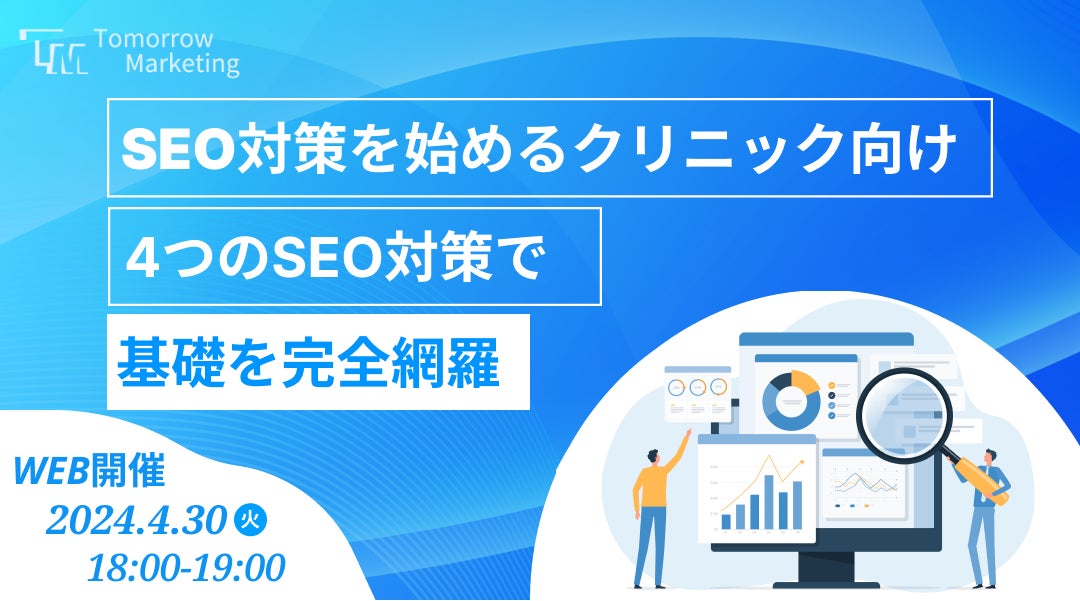 トゥモローマーケティング株式会社(本社:東京都渋谷区、代表:高木 達也、以下、トゥモローマーケティング)は、「【これからSEO対策を始めるクリニック向け】~4つのSEO対策で基礎知識を完全網羅~」についてのセミナーを2024年4月30日にオンラインにて開催いたします。また、セミナーの開催に合わせて同内容についてのホワイトペーパーも公開いたします。