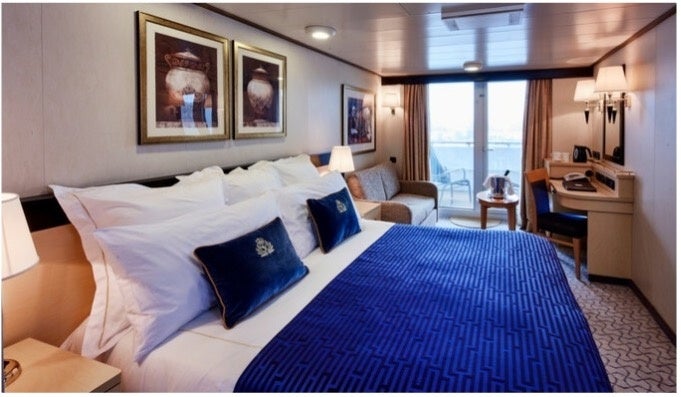 •海側バルコニー客室 / ブリタニアと呼ばれるスタンダードなクラスの客室。海を臨むバルコニー付き