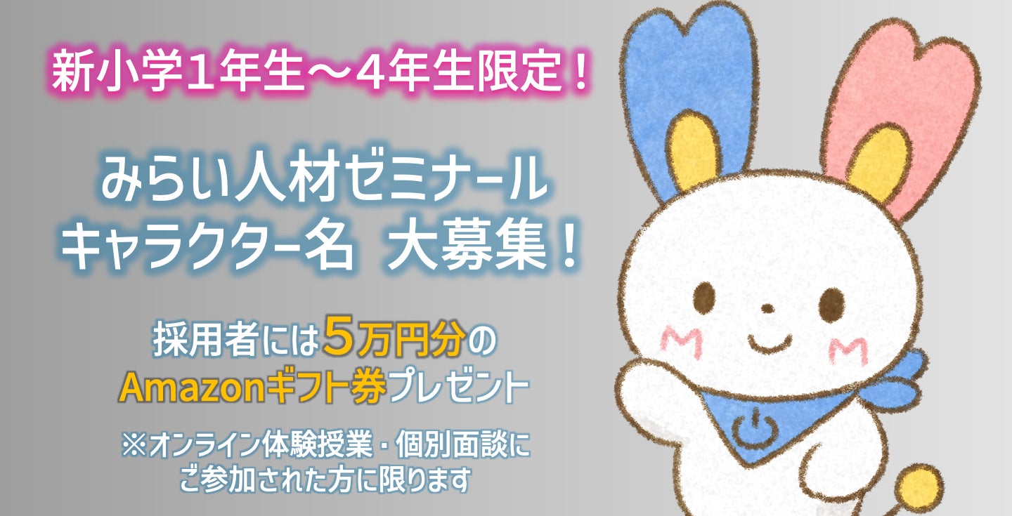小学1年生〜4年生を対象としたオンライン学習塾「みらい人材ゼミナール」は、新たなオリジナルキャラクターの名前を募集するキャンペーンを実施します。採用者には5万円分のアマゾンギフト券をプレゼントします。