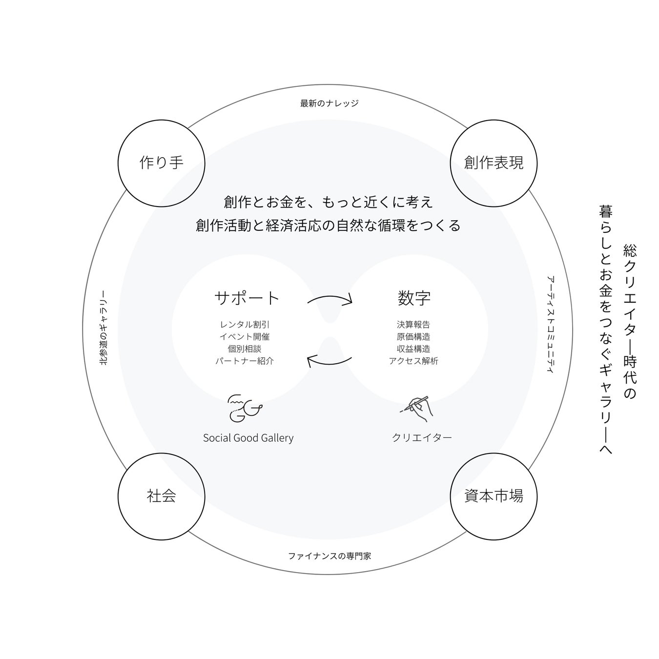 当ギャラリーは、クリエイターが抱える3つの大きな課題「創作活動の成果を発表する場の獲得」「創作活動の成果の収益化」「次なる創作活動に繋がる集客・ネットワーク構築」の解決に向けて、以下の機能を備えた社会課題解決型のギャラリーとなります。