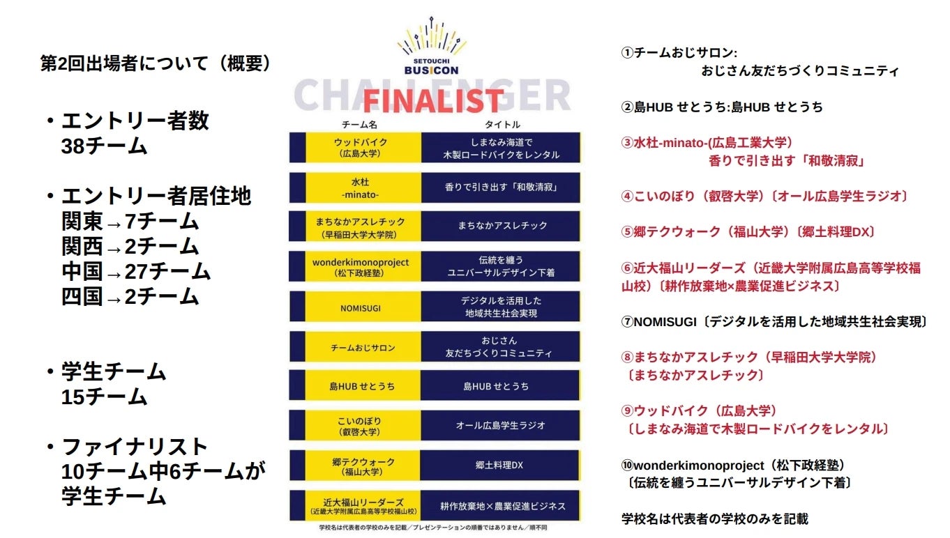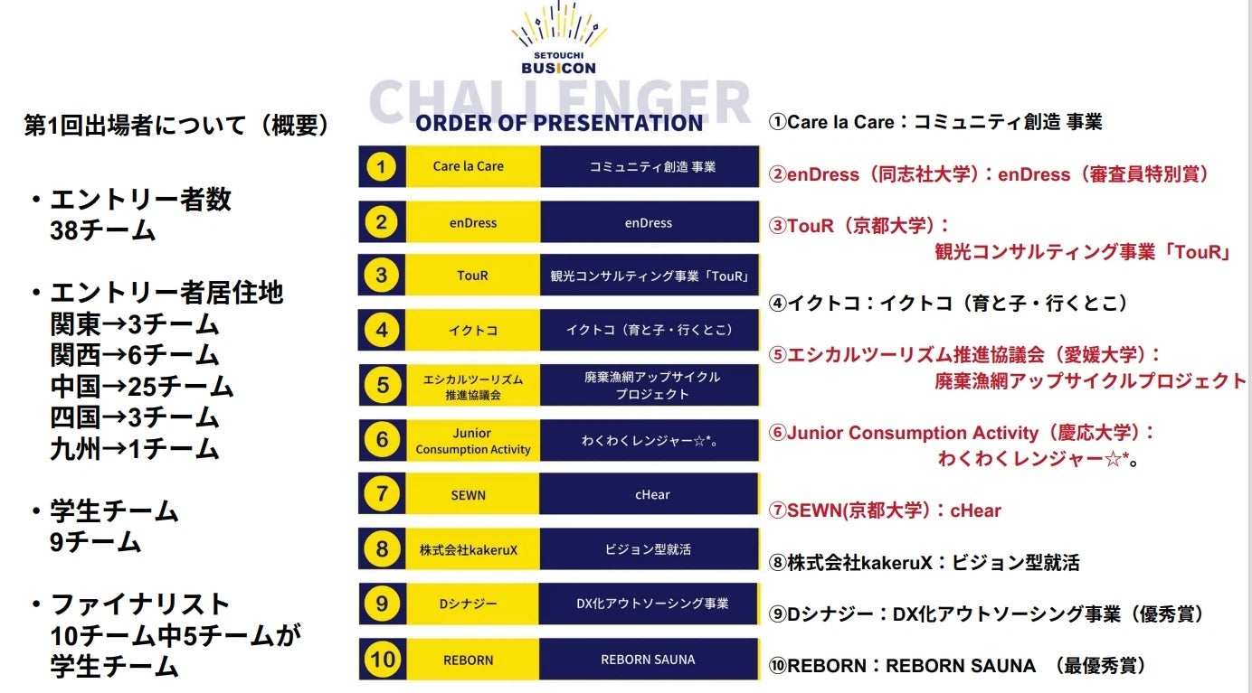 このコンテストは単なるビジネスプランの競争の場ではなく、せとうち地域の潜在的可能性を引き出し、持続可能な発展モデルを生み出すためのプラットフォームとなっています。学生から社会人まで、幅広い層の参加者が地域の未来を共に考え、新たなビジネスの種を育てる場として機能しています。