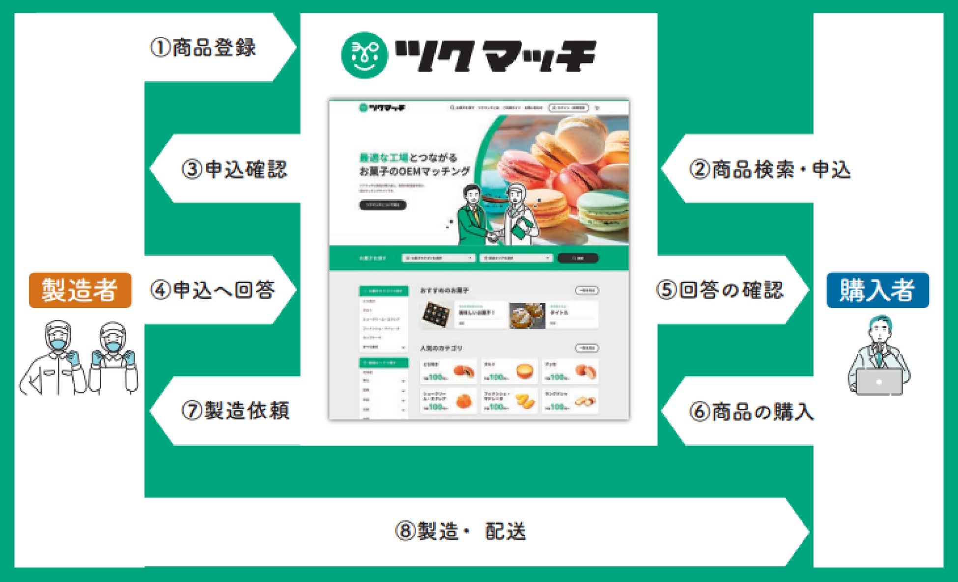 ツクマッチは株式会社マスダックが運営するお菓子を中心とした食品のOEMマッチングサイトです。お菓子の製造者と購入者をインターネット上で繋ぎます。OEM商品の売買取引ができる機能の他、食品製造委託について相談できるコンシェルジュサービスも用意してOEMをサポートします。