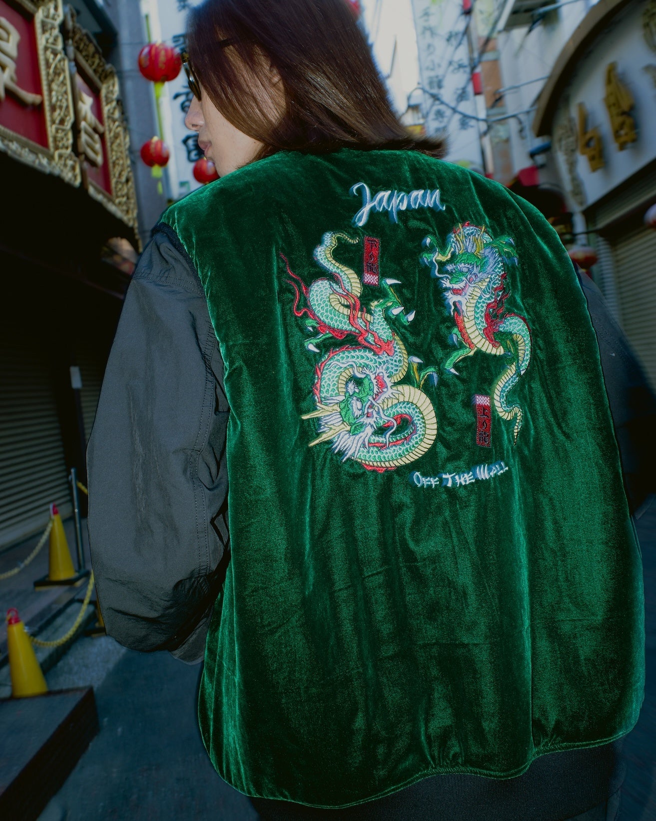 2024年の干支である「龍」をテーマにデザインしたBILLY’S別注のVANSのリバーシブルベスト。MA-1ジャケットをベースにしたベストタイプを採用し、表側はブラックのベーシックなベストで使い勝手がよく、裏側はベロア素材にスカジャンをイメージした刺繍を入れてインパクトのあるデザインに仕上げている。