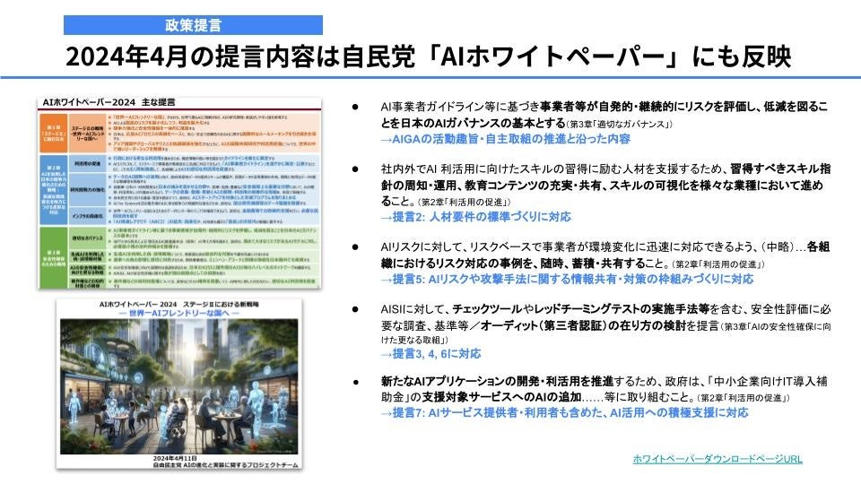 2024年4月11日(木)に自民党デジタル社会推進本部第40回「AIの進化と実装に関するプロジェクトチーム」で議論され、翌12日(金)にデジタル社会推進本部にて了承された「AIホワイトペーパー ステージⅡにおける新戦略 ー世界一AIフレンドリーな国へー」と並行して、民間事業者の知見・意見を政策検討の場に届けるべく、AIGA会員のAIガバナンス構築の実践・課題に基づいて提言を取りまとめました。