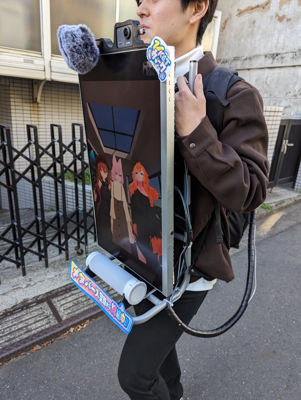 VketWalkはResoniteやVRChatなどのVRSNSプラットフォームのユーザーが、アバター姿のまま現実の街を歩き回ることができる完全可搬式ディスプレイシステムです。バーチャル↔現実の相互で音声、映像を介したコミュニケーションが可能です。