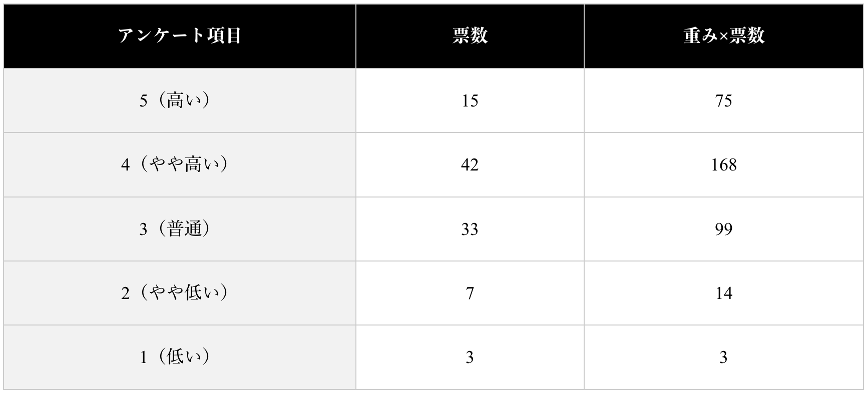 上記のアンケート結果の場合、「75+168+99+14+3」の合計数359を、総票数100で割った結果の「3.59」が点数となります(5点満点)。