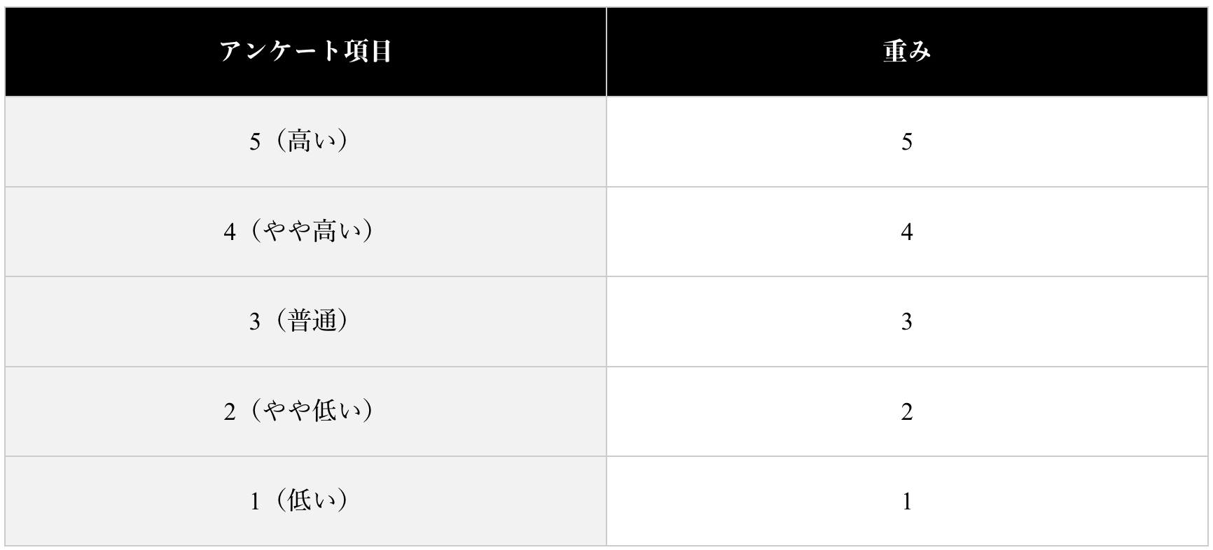 アンケートの点数算出方法として、以下の重みを用いて計算しています。