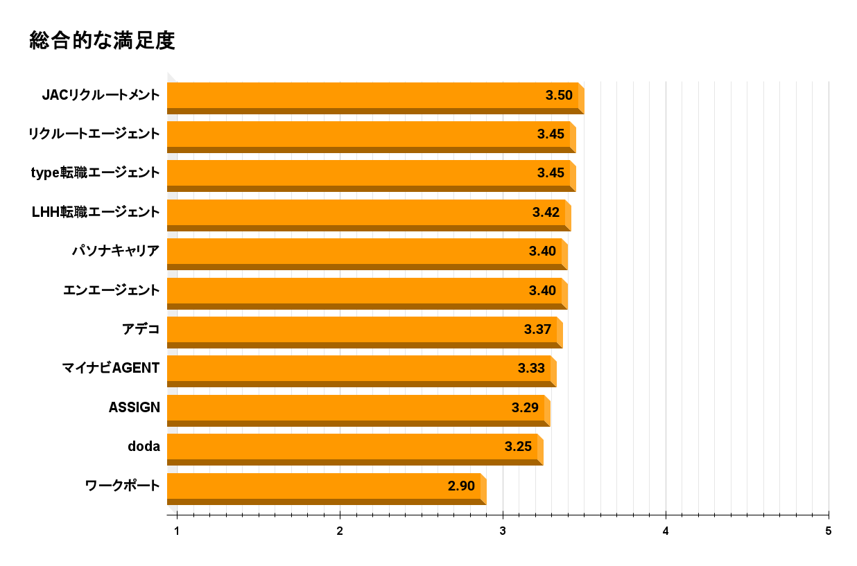 「総合的な満足度」について各転職エージェント利用者にアンケート調査をおこなった結果は以下のとおりです。
