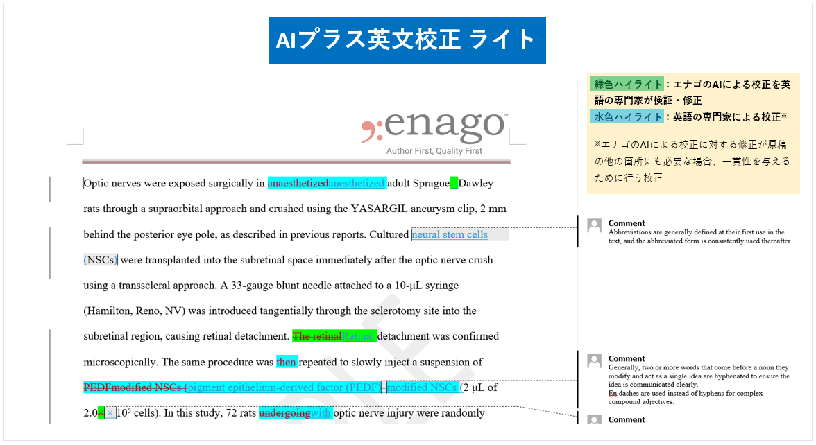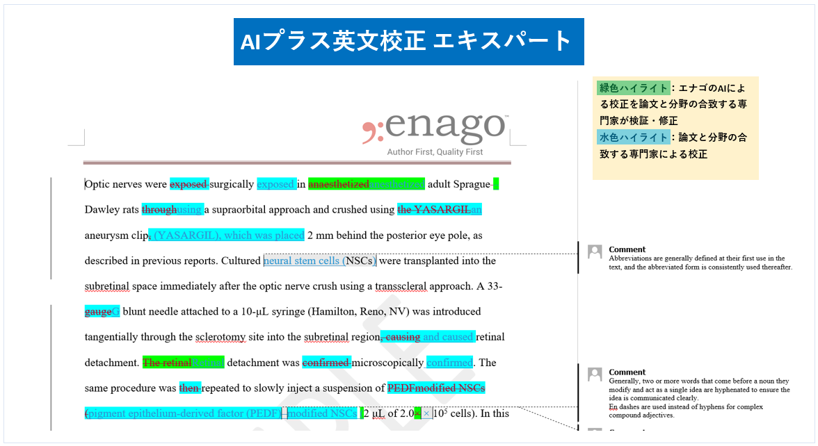 エナゴが学術英語に特化して独自開発したAIで、論文の英語をチェック。その後、学術英語の専門家である英語ネイティブが、AIの誤解釈による不必要な校正が行われていないかを検証し、必要に応じて修正します。文章の改善のためのコメントも提供します。