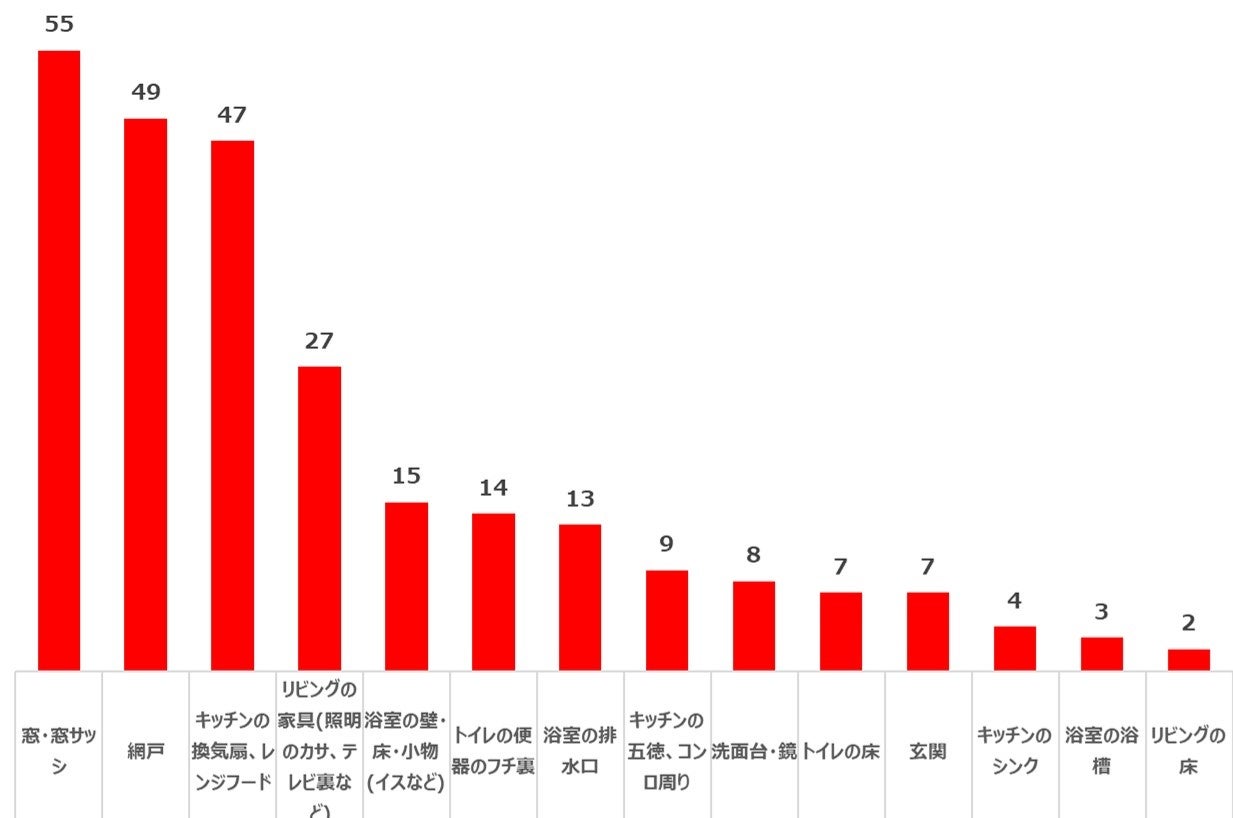 ●年末大そうじをやりたかった場所“やり残し汚れ”第1位は、「窓・窓サッシ(55%)」!